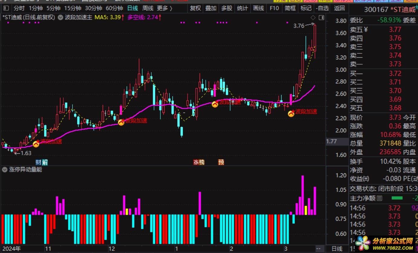 2️⃣ 主图三重复合信号(图标预警+文字提示+动能柱显)