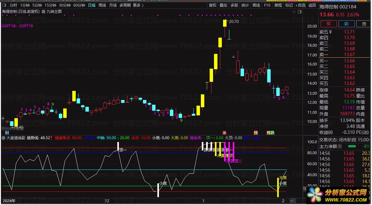 5、顶二是专门用来找个股顶部的。出现顶二信号时,要么是次顶,要么就大顶。同样出现钝化情况的话,看主图九转,是否出现高9。