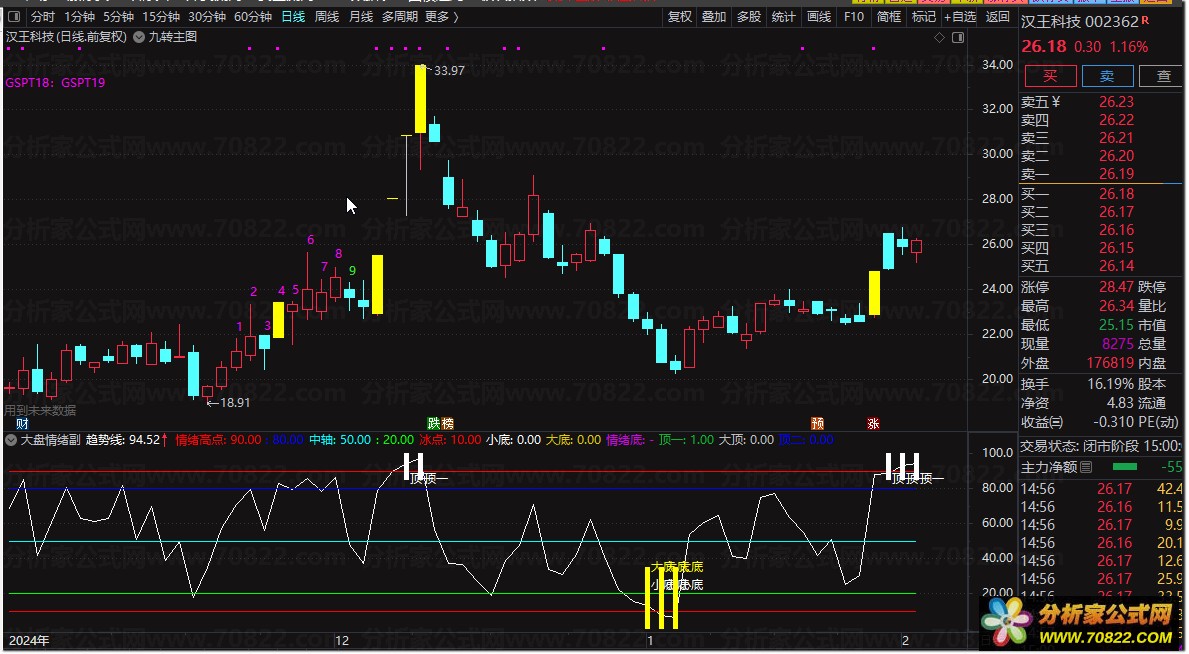 公式名为“大盘情绪”副图公式及“九转”主图公式,公式没有未来函数。