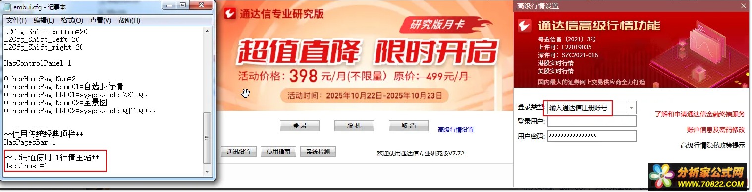 13,可在embui.cfg中设置UseL1host=1,即可在nacomte.cfg使用[L1Host],这时金融终端设置中原“输入通达信金融终端账号”改成“输入通达信注册账号”,输入注册的的账号(不是L2账号)就能登录,云同步,财富圈,问小达,指标平台就能使用;