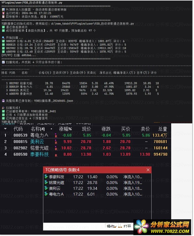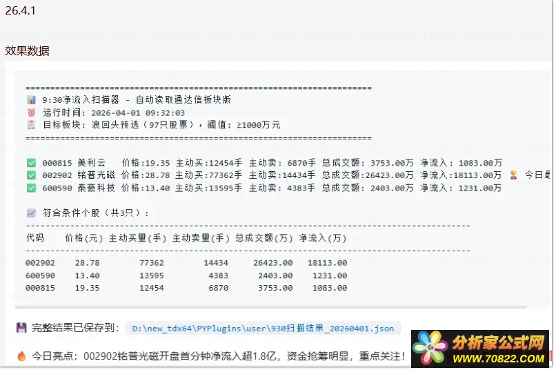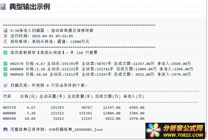 这款工具就是专门为这个场景开发的:**自动读取通达信自定义板块的股票列表,批量扫描所有股票9:30首分钟的逐笔成交数据,精确计算主动买卖净额,自动筛选出净流入超1000万的强势标的**。