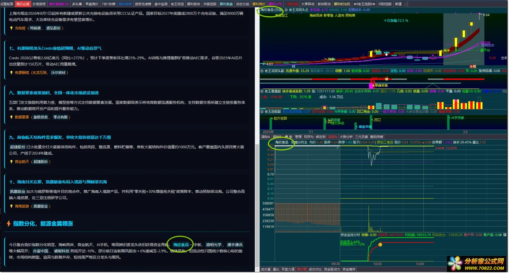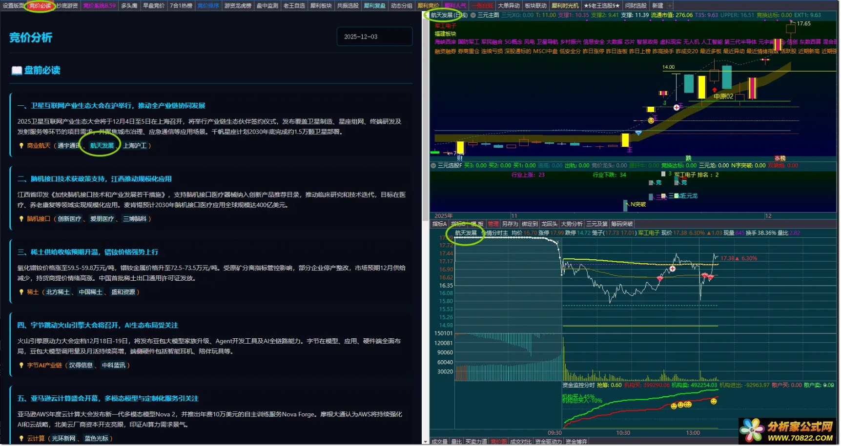 3、在定置版面中选竞价必读,即可看到下图,小技巧好处在于发现新闻热点后,点击风口票,可以在右边的分析图和分时图上联动看盘,在分时图上可以直接下单,以便在竞价时段抢单