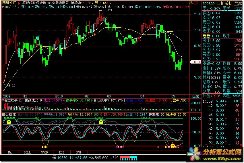 2.当短线风险大于80,且散户下穿庄家线时可以考虑卖出,同样顶部暗绿色区域出现准备卖出,亮绿色出现卖点更为可靠.
