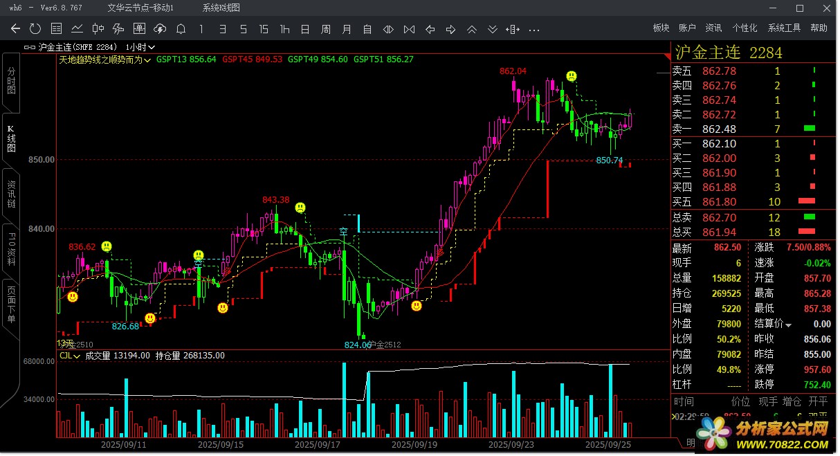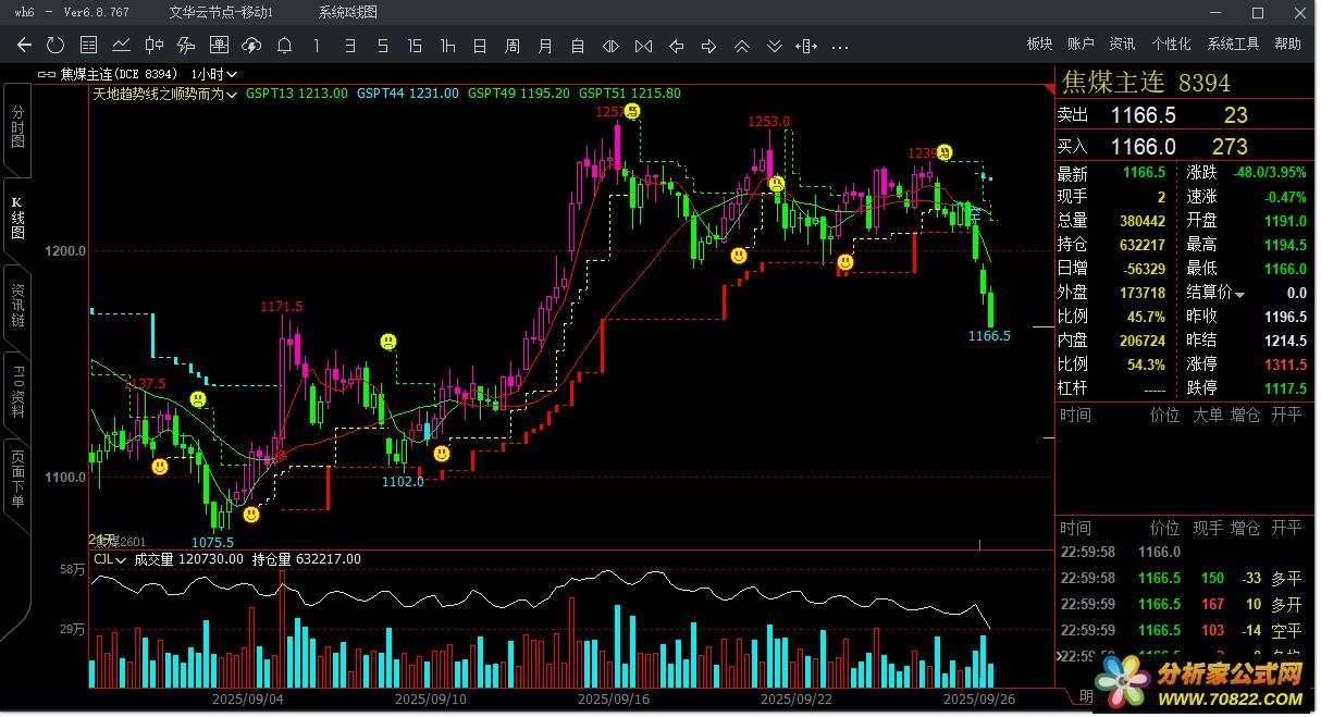 • 多空信号可视化:利用DRAWLINE与DRAWSL函数绘制趋势线,以绿色点线标注多头趋势,黄色点线标注空头趋势,并通过DRAWTEXT在图表上直接显示“多”、“空”文字提示,直观清晰。