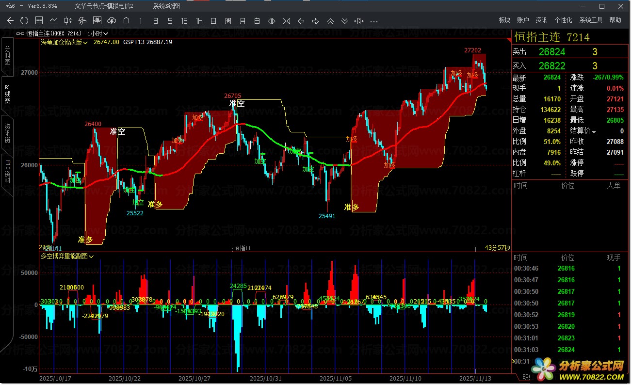 基于经典海龟交易法则优化,通过动态捕捉价格高低点与趋势强弱信号,结合成交量资金流及价格波动率,实现精准多空判断。 创新加入“加空/加多”信号,在趋势延续时通过3条加仓线(绿/红线)动态提示加仓时机。