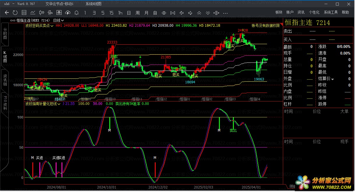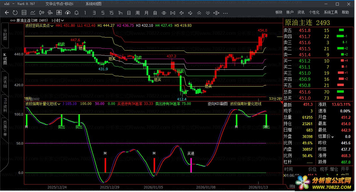 〖波段指南针量化短线〗文华财经指标 高收益率实战策略 波段指南针量化短线指标属于量化系列指标,加载后可直观显示部分精选信号在持有5根K线周期内的胜率。胜率数据基于最近30天统计,若品种上市时间不足30天,则采用合约上市至今的全部历史数据。用户可优先筛选胜率介于60%至80%之间的交易品种。需注意,胜率并不等同于实际收益率,在正式使用前建议将指标代码适配为文华T8或T9模型进行回测,剔除收益率为负或交易次数过少的品种,以提升策略有效性。此外,为确保数据准确性,加载指标后请至少压缩显示30天的K线数据(可通过键盘方向下键操作实现)。