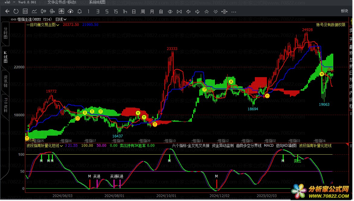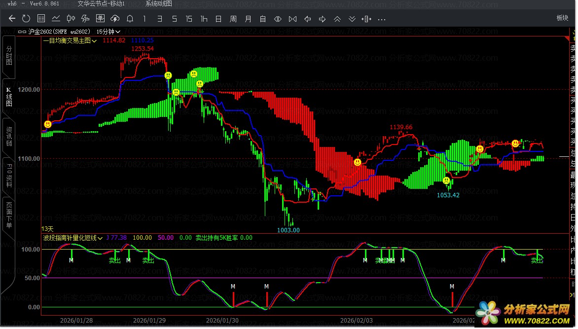 〖一目均衡交易主图〗洞悉多空云图,精准捕捉趋势拐点![文华财经] 本公式基于经典“一目均衡表”(Ichimoku Kinko Hyo)原理深度优化,融合价格、时间与趋势三重维度,助您一眼识别市场强弱格局。公式核心由转换线、基准线、先行带及迟行线构成,并通过彩色K线与云层直观呈现多空信号。
