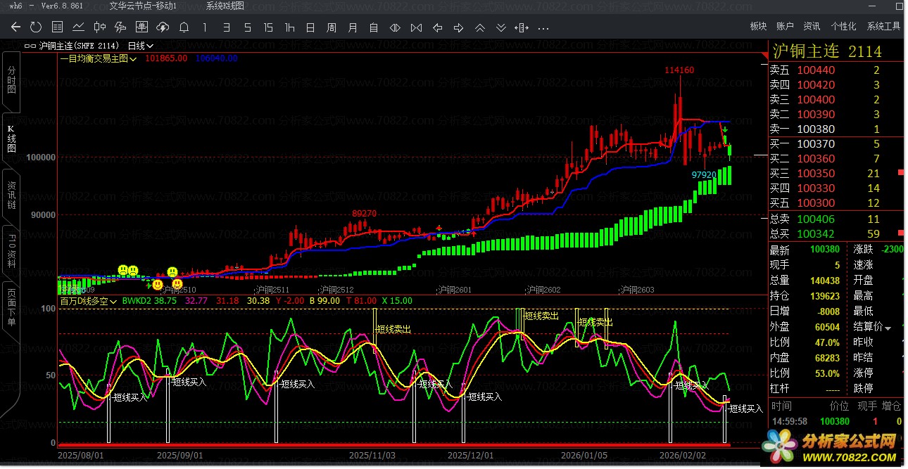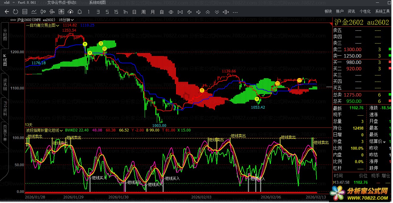 “百万D线多空副图”是一款基于多周期高低点均值构建的趋势判断与自动交易信号系统。它融合9日、26日和52日三个关键周期的高低点中轴线(gspt0~gspt5),通过动态比较价格与中轴位置关系,智能识别多空强弱。当短期中轴上穿长期中轴且价格站稳多重压力位时,系统发出做多信号(BPK/BP);反之则触发做空信号(SPK/SP)。同时,公式使用FILLRGN函数以红绿区域直观展示多空分界,配合DRAWKLINE1保留原始K线形态,兼顾视觉清晰与策略逻辑。