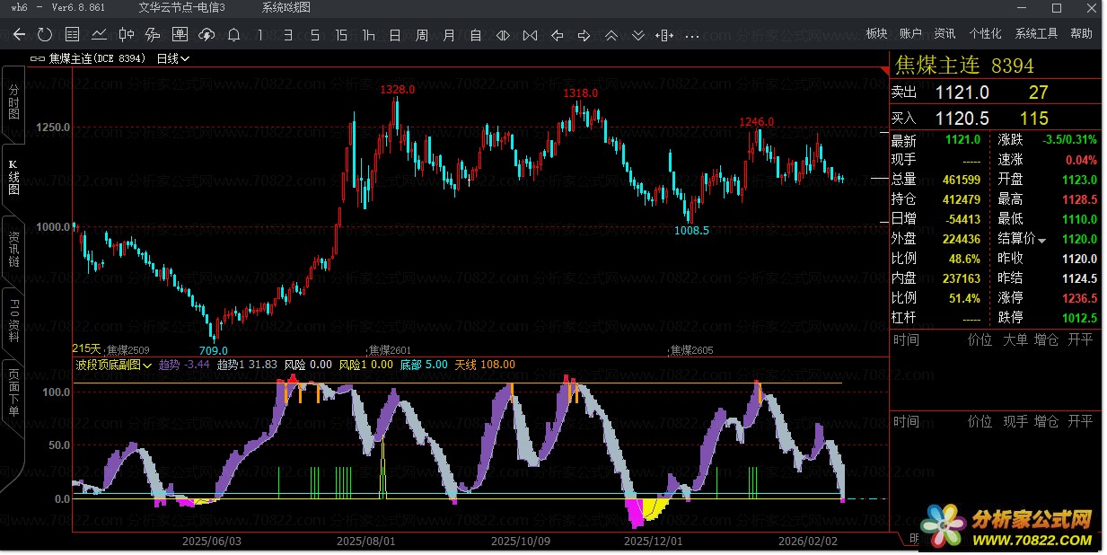 该公式核心采用改进型随机指标算法,通过多重平滑处理(SMA与EMA组合)构建“趋势”主线,并辅以“趋势1”作为信号确认线。当趋势线上穿趋势1且数值高于108时,红色柱体提示超买风险,警示逃顶;当趋势线下穿0轴并低于趋势1时,绿色柱体显示超卖机会,提示抄底。更独特的是,公式内置“风险”与“风险1”双重预警机制,结合5日、20日及120日均线系统,识别连续上涨后的高位回调风险,有效规避追高陷阱。