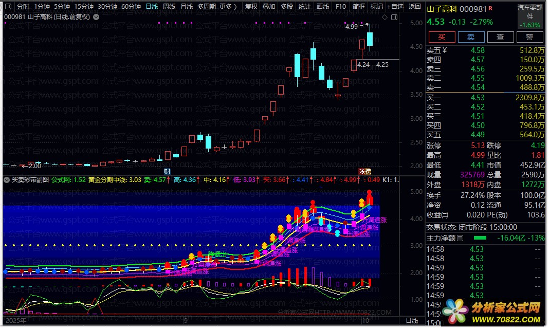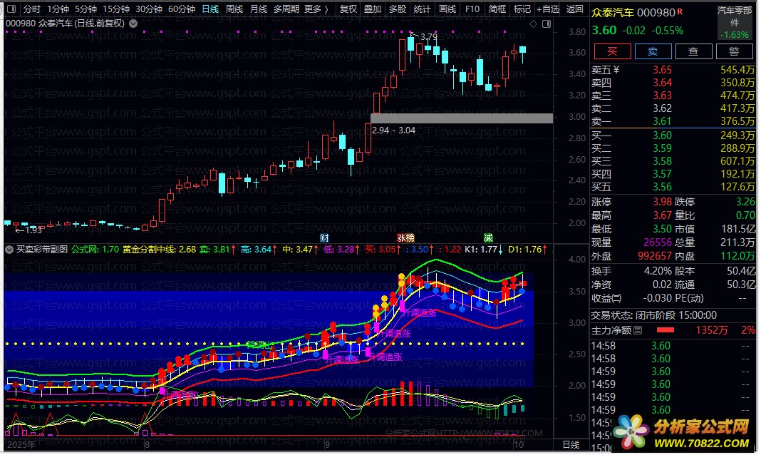 多维共振彩带:一眼看透股价支撑压力与买卖点 这款“买卖彩带副图”公式是一款综合型技术分析工具,它通过多维度视觉提示将复杂的市场信息简化为直观的彩色信号带,帮助投资者快速把握股价关键位和趋势动向。 公式核心原理 该公式巧妙融合了四种关键技术元素:通过计算年内最低点形成基准线(公式网),以此为基础构建黄金分割压力支撑带,直观显示高压到超跌的多层空间;同时,它整合了MACD动能柱的彩带显示,用红绿颜色变化反映趋势强弱;还包含基于5日高低点判断的红蓝K线彩带,以及围绕5日均线设置的五档买卖点提示线(买、低、中、高、卖)。 实战应用指南 • 趋势判断:观察MACD彩带是否持续在基准线上方(红色)判断强势,结合K线彩带颜色识别短期方向。 • 买卖决策:当股价接近“买”线或“低”线且出现企稳信号时,考虑买入;当股价接近“卖”线或“高”线并出现滞涨时,考虑卖出。公式中的“升调追涨”和“降调出”文字提示可作为参考。 • 风险控制:黄金分割支撑带与“财神”抄底信号相结合,有助于识别关键支撑位。当股价进入超跌区域时,需格外警惕风险。 提示:此工具为辅助指标,建议结合成交量与其他指标综合判断,并注意市场整体环境。 附件里的公式如上图,1个副图,不加密,提供源码文本txt。 |