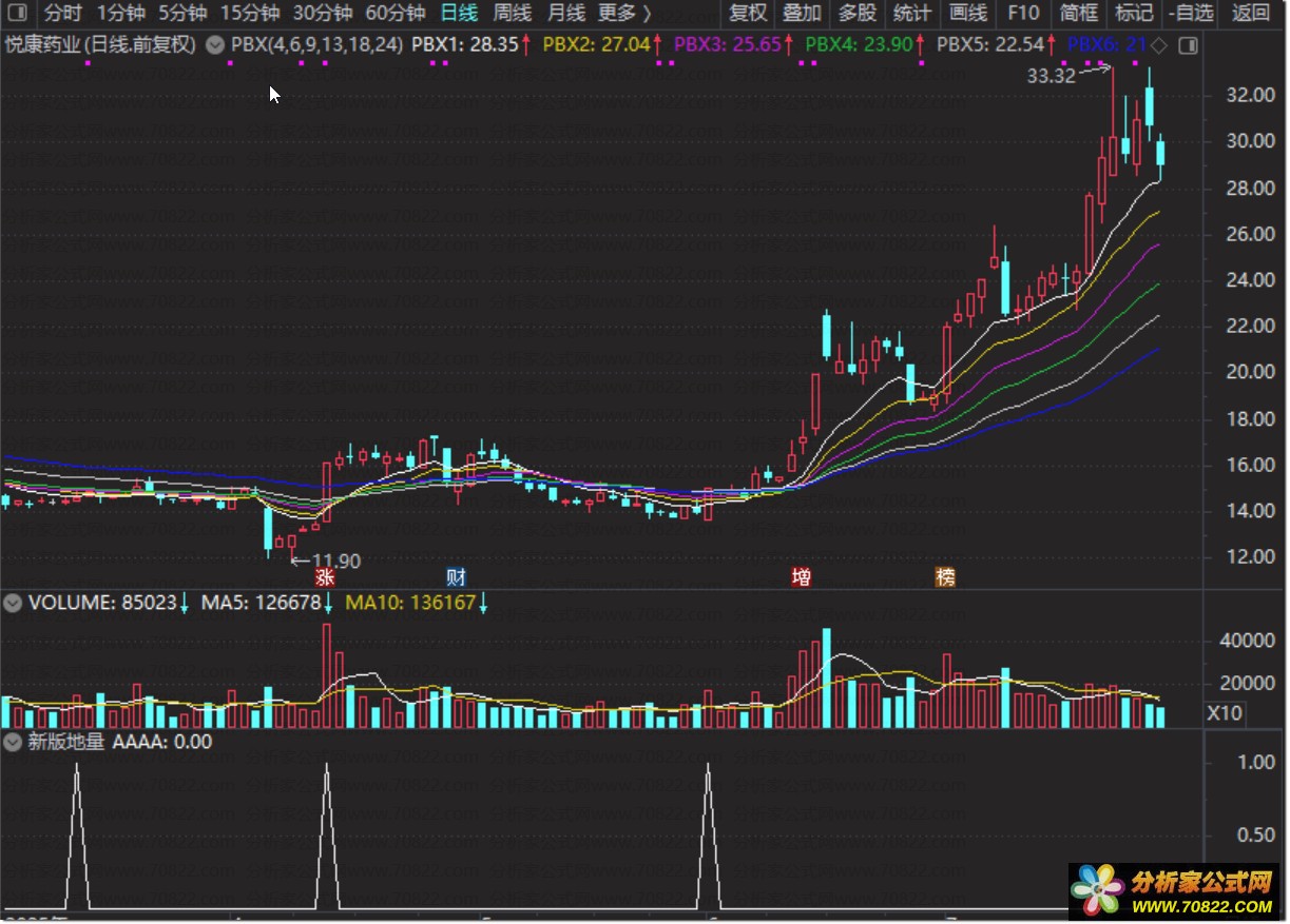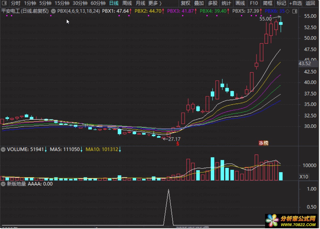 地量选股公式:=EMA(EMA(CLOSE,13),13);