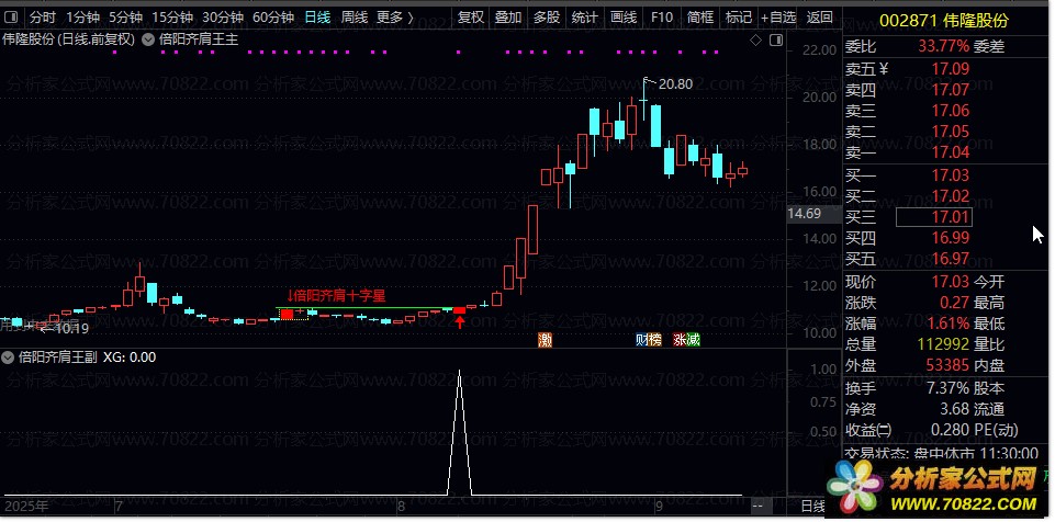 倍阳齐肩王形态识别 倍阳龙头突破加速信号捕捉 该K线组合结构清晰:首日阳线放大,次日跟十字星。 操作策略一、预警阶段(黄色柱出现): 操作策略二、确认阶段(红色箭头出现): 操作策略三、强化信号(出现文字提示): 倍阳齐肩王主图: