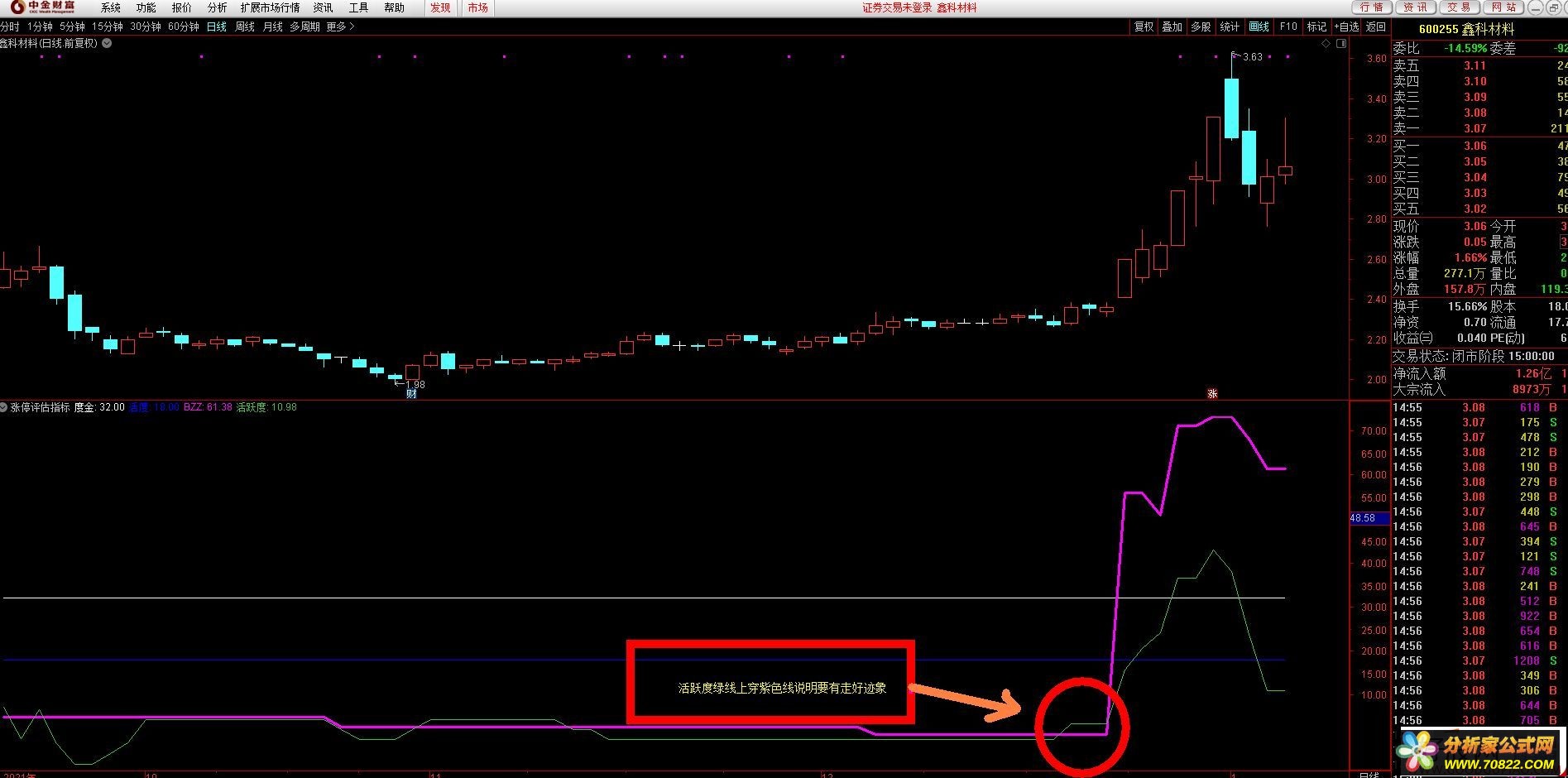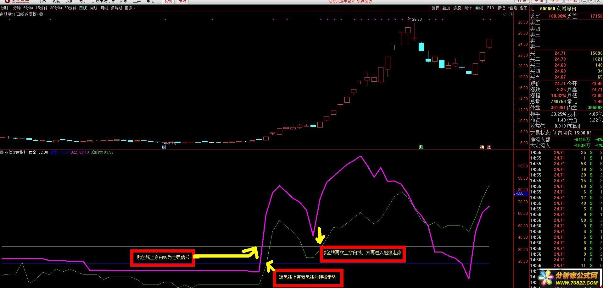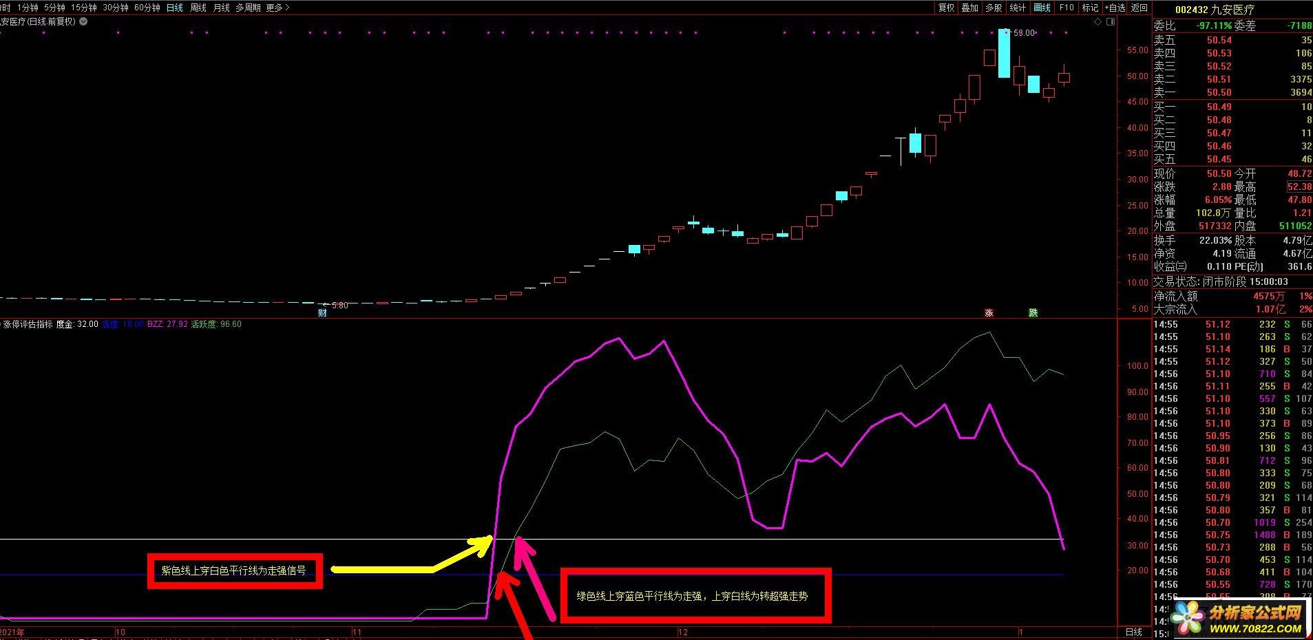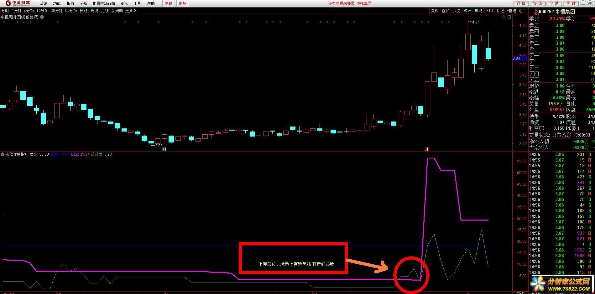 紫色线上穿镀金线表示第一个涨停板出现。若紫色线持续上升,表明后续可能继续出现涨停板。当紫色线回落到镀金线或活度线附近并走平时,表明进入盘整阶段,等待再次启动的机会。