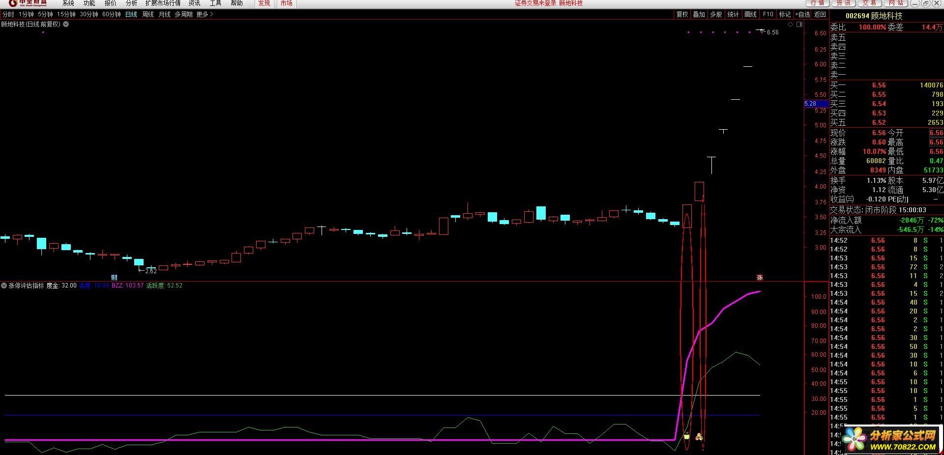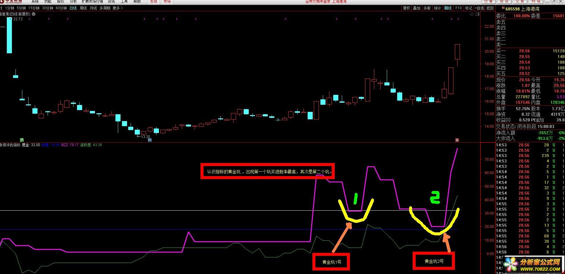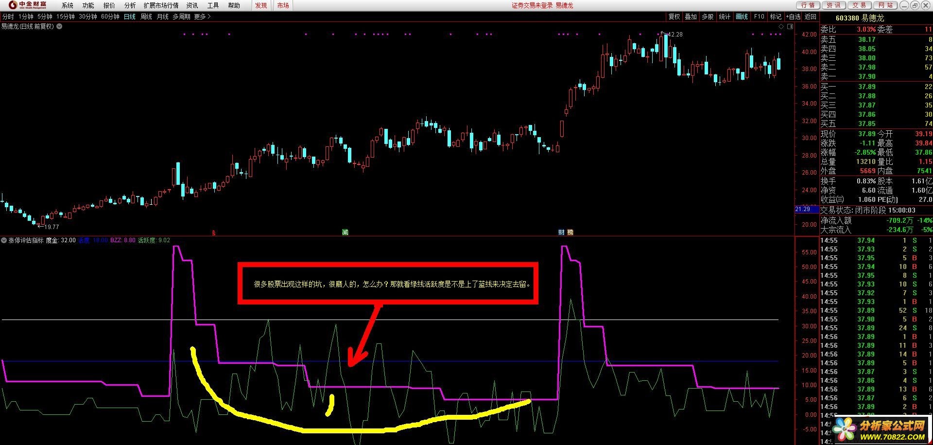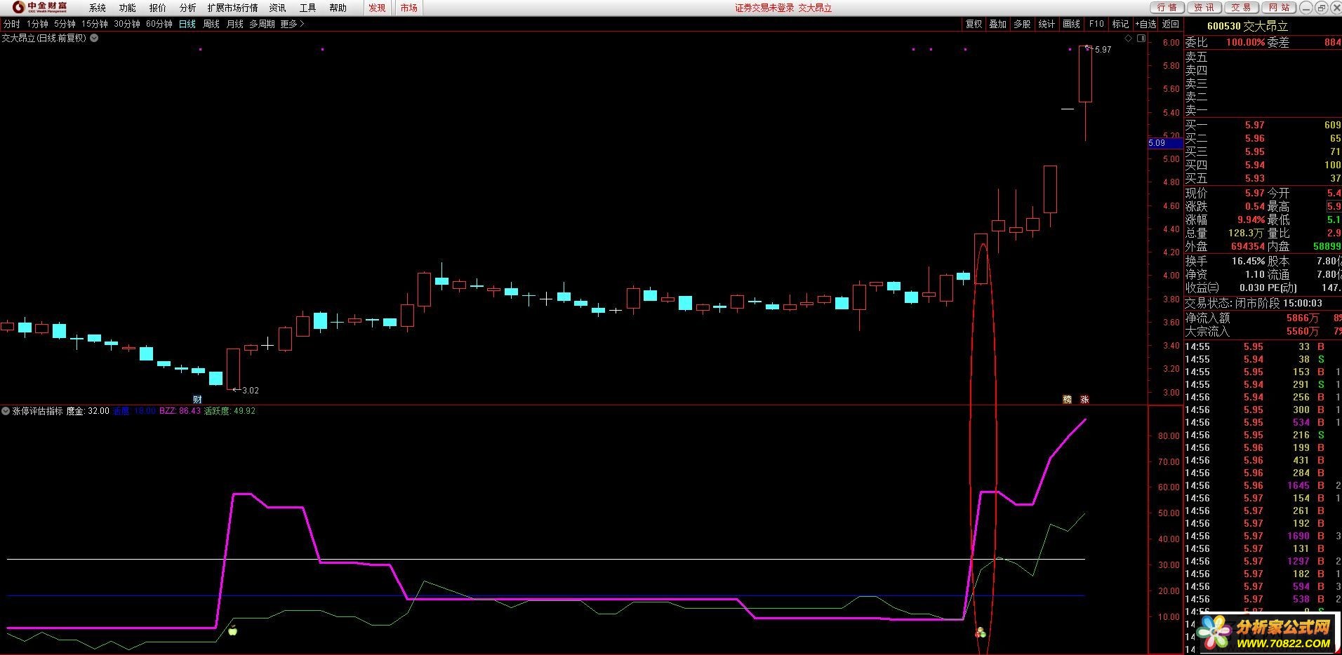 紫色线上穿镀金线表示第一个涨停板出现。若紫色线持续上升,表明后续可能继续出现涨停板。当紫色线回落到镀金线或活度线附近并走平时,表明进入盘整阶段,等待再次启动的机会。