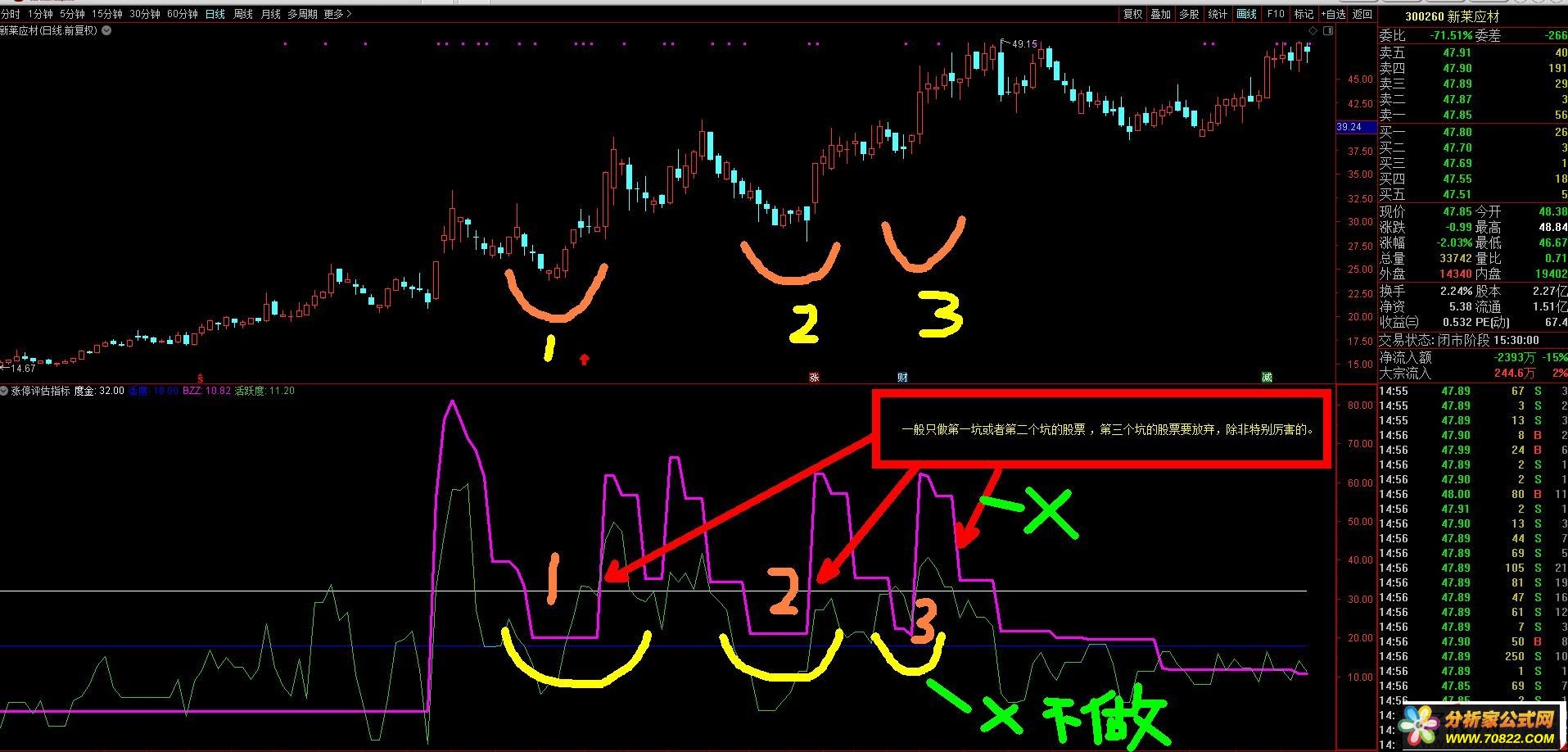 若峰值回落后15-20日内未能重新启动,表明洗盘开始,后续峰值需重新计算。第一个峰值回落后形成坑形形态时,通常是低吸做回马枪的时机,且第一个坑的有效性比后续更高。