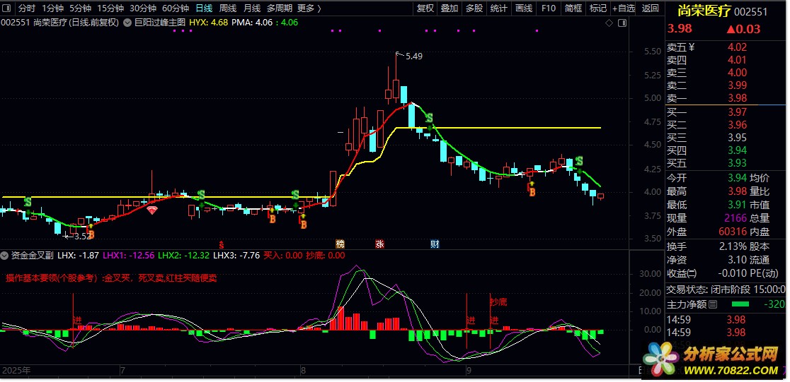 双轨趋势线包含HYX长期趋势线(黄色,默认130日周期)与PMA动态变色线。HYX线捕捉中长期趋势,支持自定义周期适配不同风格,股价在其上方运行时视为强势区。PMA线采用三态变色:红色做多(站稳5日均线)、白色预警(KDJ死叉拐点)、绿色观望(跌破10日均线)。