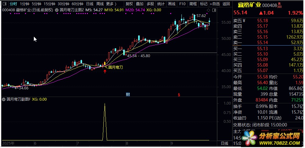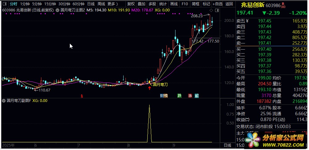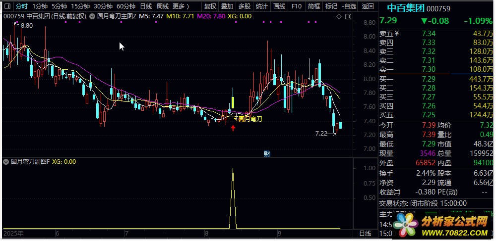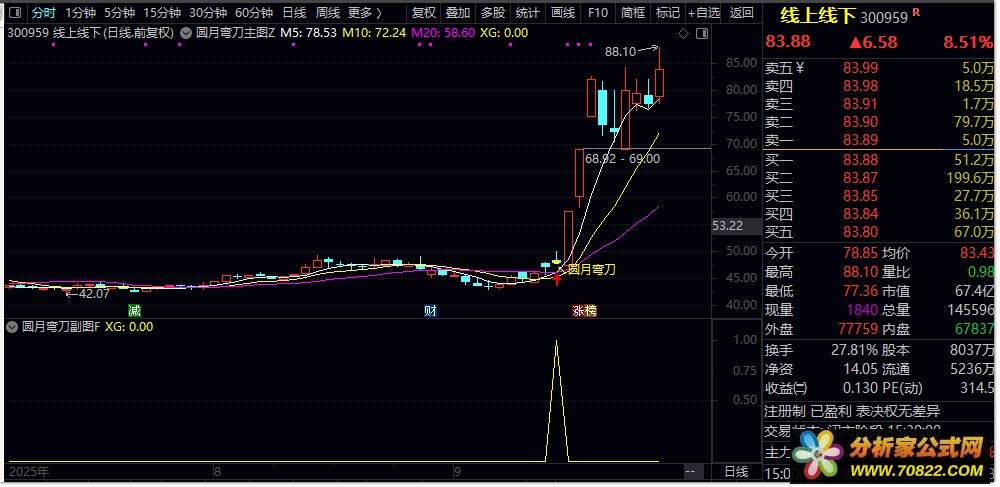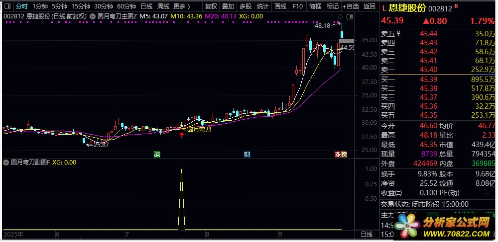 1、圆月弯刀形态由两部分构成:首先连续五日收于5日均线下方形成挖坑形态,随后突破5日线后连续五日沿5日线爬升,整体形态宛如弯月刀锋。该形态通过5日线上下波动捕捉波段机会,适合中短线操作。