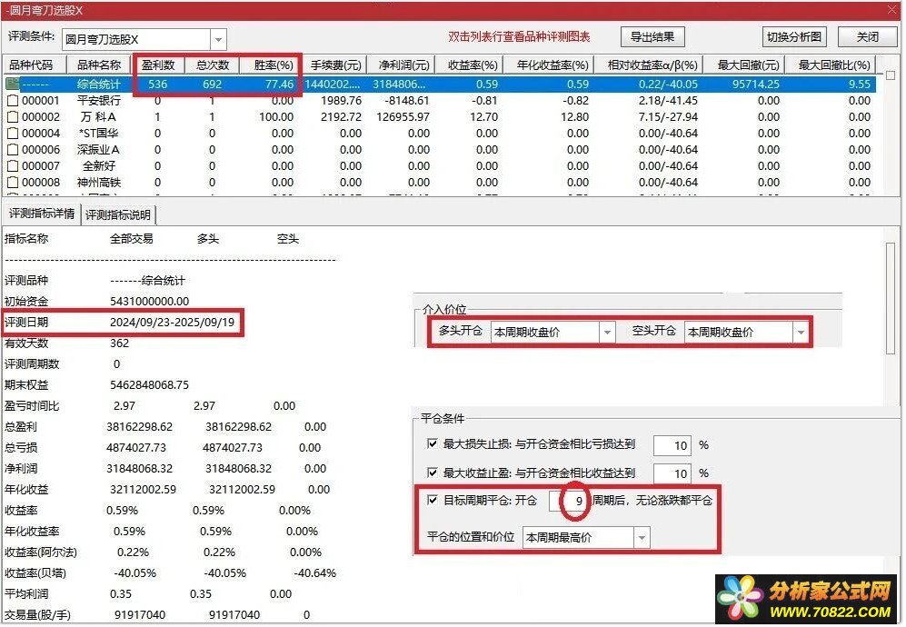3、本策略属于波段操作思路,非即时启动型。按收盘价介入后,持有10日以最高点离场,或设置10%止损止盈。经近一年实测数据显示,该策略胜率达77.46%,表明其安全边际较高,适合稳健型投资者参考。
