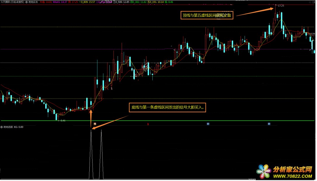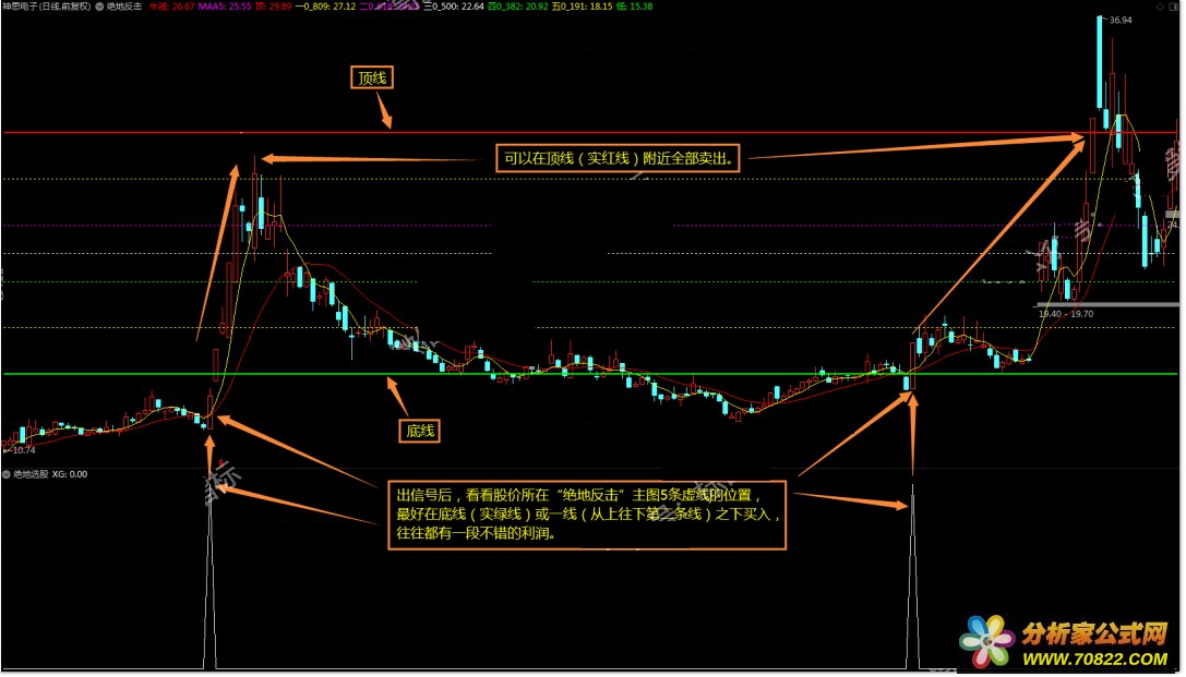 2、“绝地选股”指标适合盘中或尾盘操作,新手建议优先关注尾盘机会。预警信号出现时,需观察股价在主图中的位置:理想买入点位于底线实绿线或一线虚线下,预示后续利润空间;顶线实红线附近则为理想卖出时机。位置判断是操作成功的关键要素。
