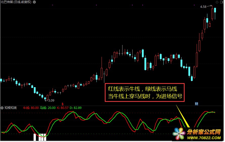 牛线红线与马线绿线交叉为关键信号:牛线上穿马线时发出进场提示,结合副图彩柱信号更佳。