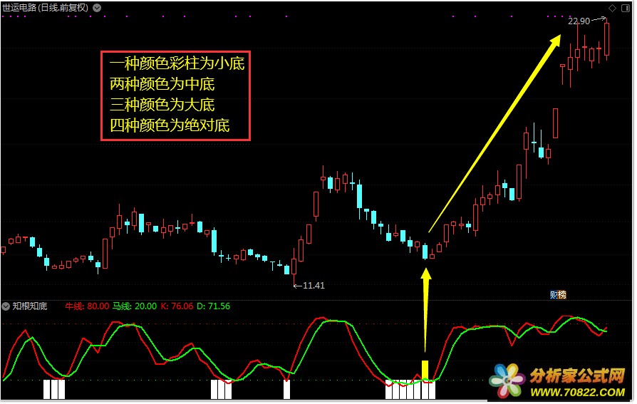 〖知根知底〗副图与选股指标详解——稳抓底部不求人(附使用方法) “知根知底”副图指标及选股策略为通达信经典工具,无未来函数,聚焦股价低位研判。该指标通过颜色数量精准界定底部层级:单色彩柱为小底,双色为中底,三色为大底,四色则构成绝对底,助力投资者捕捉底部机会。下面详述使用方法: