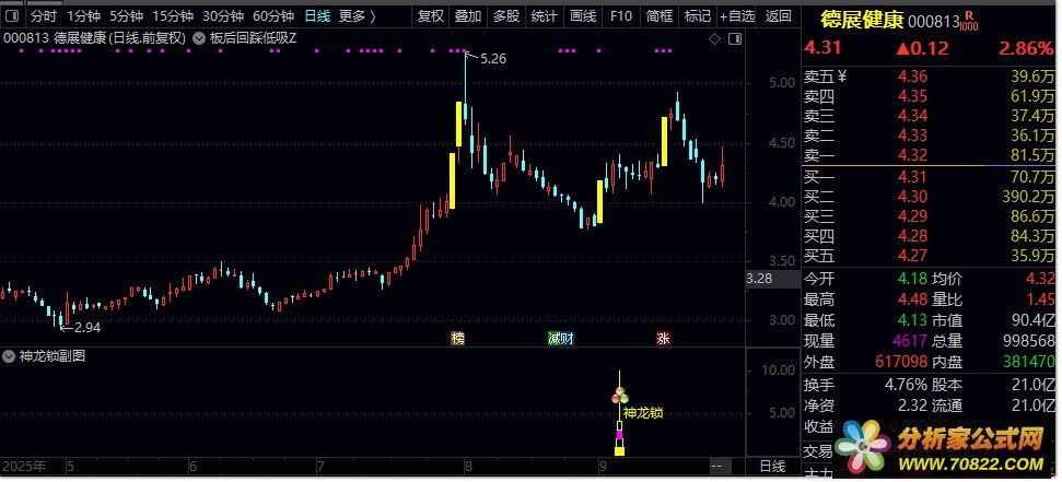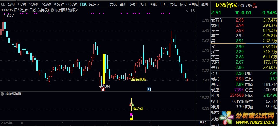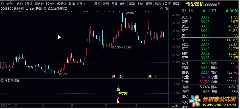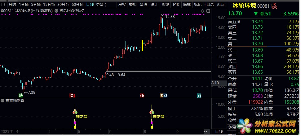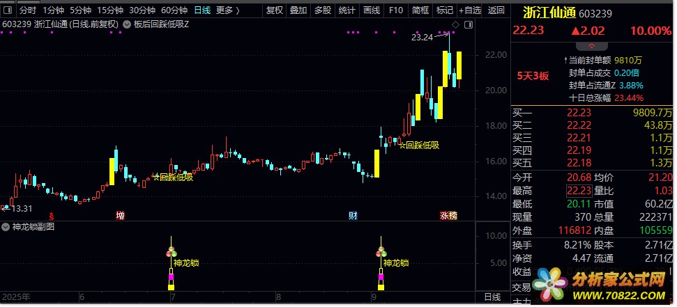 1. 信号识别:当主图出现黄色"神龙锁"文字标注及高亮K线时,表示符合所有买入条件。