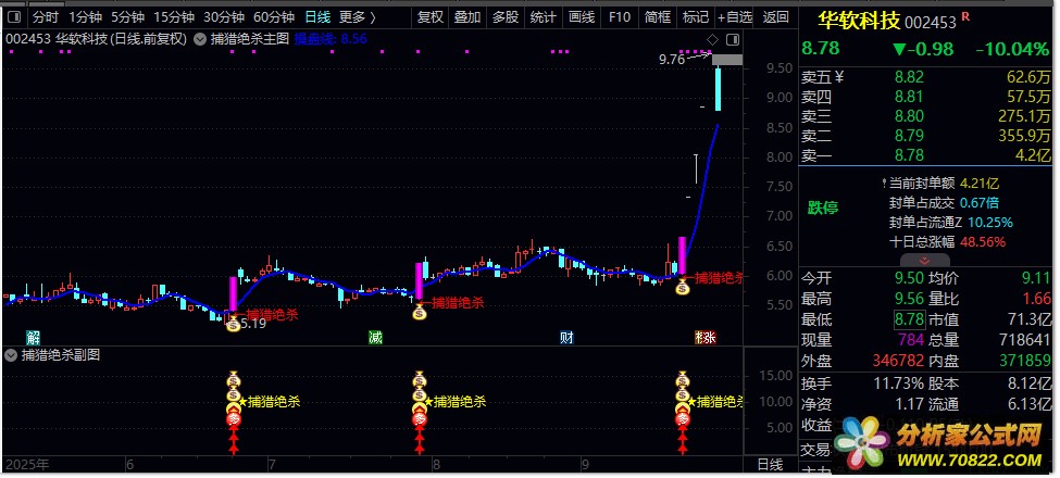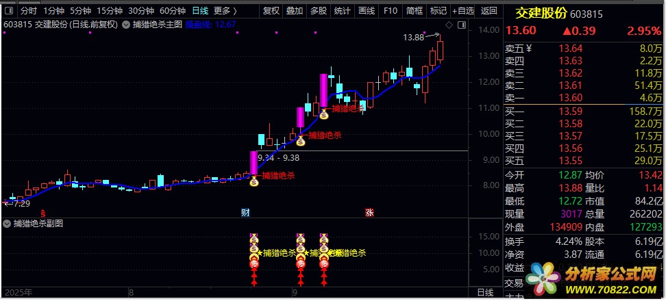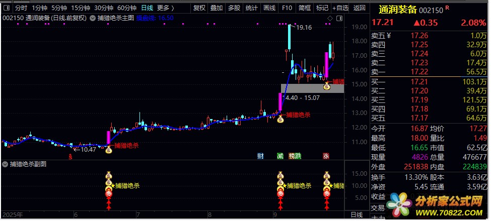 主图应用:当股票满足条件时,K线会变为紫色柱状并标注“←捕猎绝杀”文字,提示短线启动点。