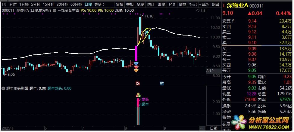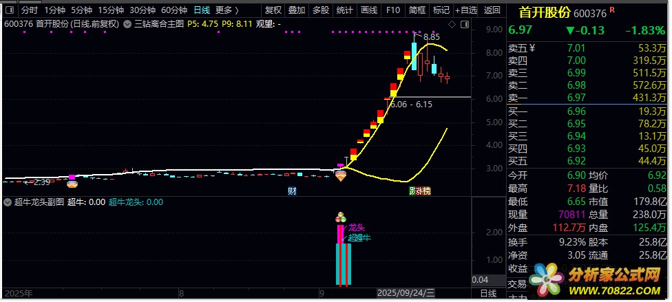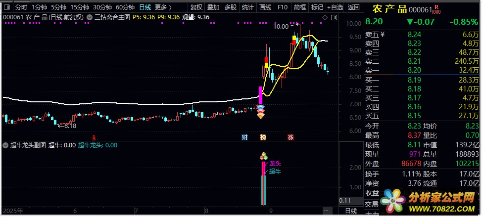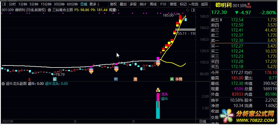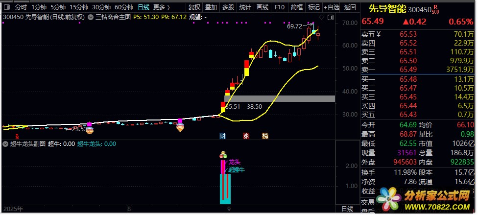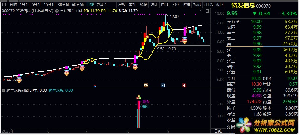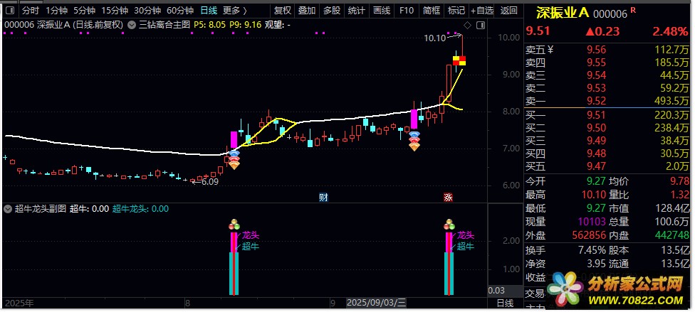 2. 超牛龙头:满足三重过滤条件且涨幅>9.3%,出现蓝色柱状+超牛文字