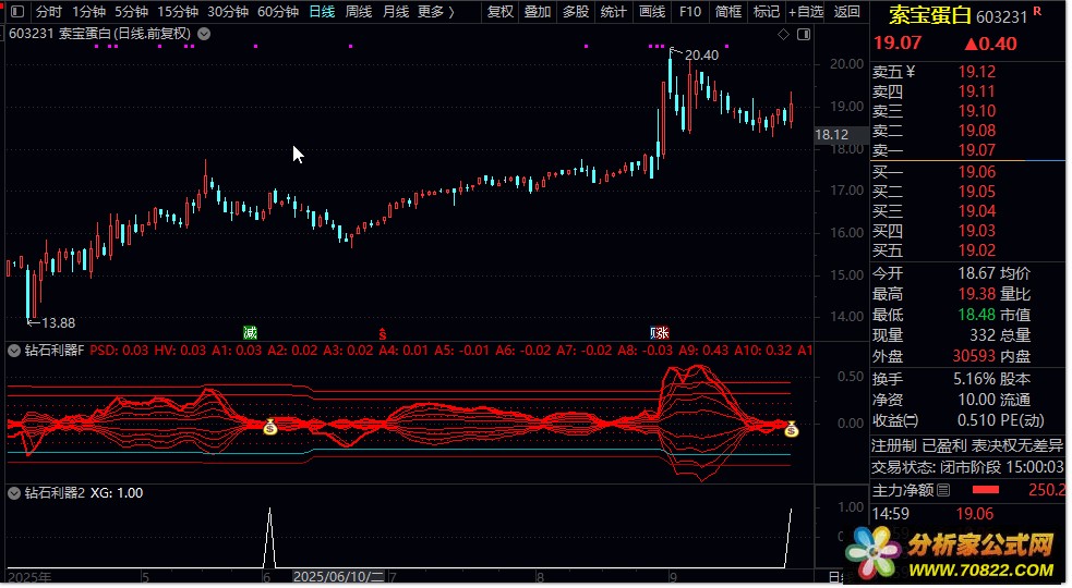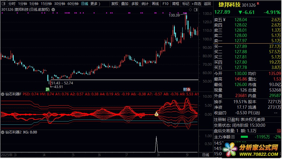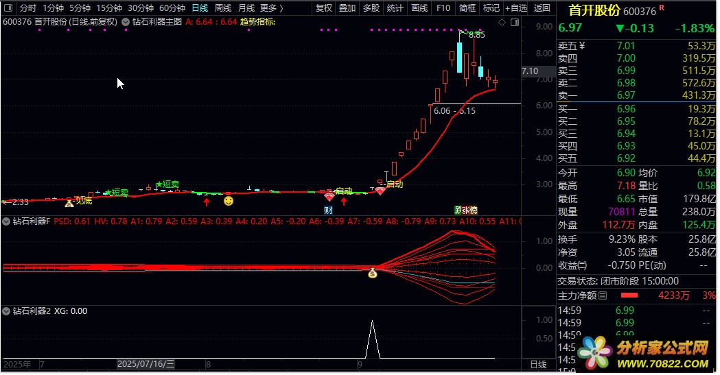 核心逻辑,该指标通过计算短期与中期指数移动平均线(EMA)的差值(PSD线),并构建一个动态通道(A2至A8)。当PSD线强势突破多层通道,且股价均线呈多头排列、成交量放大时,发出选股信号。它结合了趋势强度(PSD突破)、趋势方向(均线排列)和资金认可(成交量)三个维度进行综合判断。