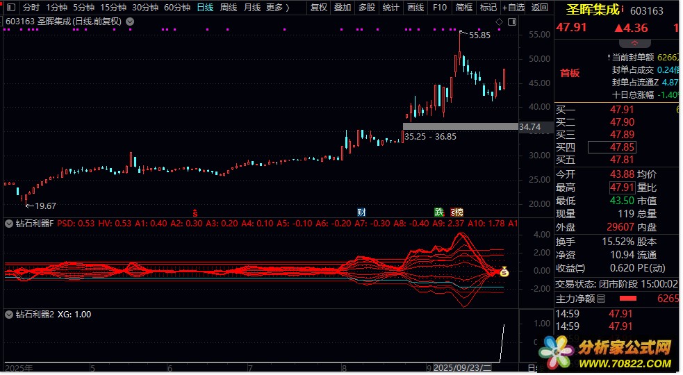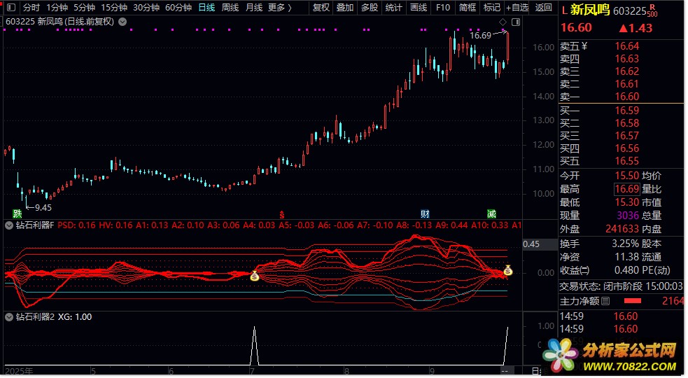 主图“钻石”图标=右侧启动信号,副图同期“钱袋子图标+趋势线明显发散”=右侧启动双保险。