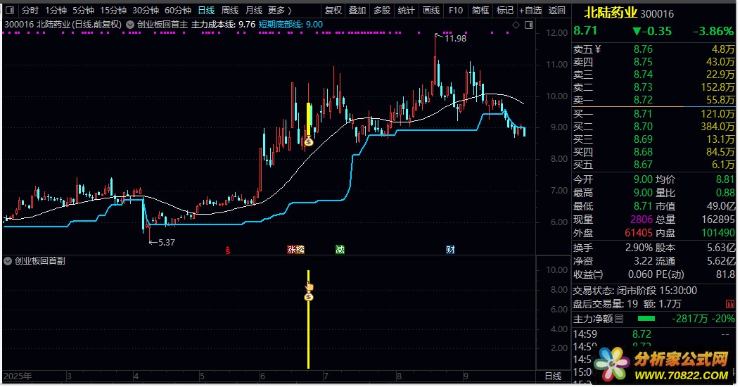创业板首板回调主副图+选股 高胜率回调二次拉升战法 创业板回首源码 本指标专为捕捉创业板股票涨停后的高胜率回调买入机会设计。核心策略是:当股票首次涨停后(非连续涨停且前两日涨幅不超过10%),在15日内回调至涨停最低价附近(波动范围±3%),且当日跌幅不超过2%时,系统触发黄色柱状信号和图标提示。操作上,投资者可关注此类高胜率信号,结合次日跌幅不超过8%的条件进行短线介入,捕捉回调二次拉升机会。