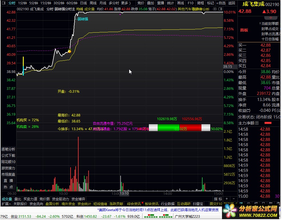 追击涨停:=限制散户线>分时均价线 AND CROSS(C,限制散户线);