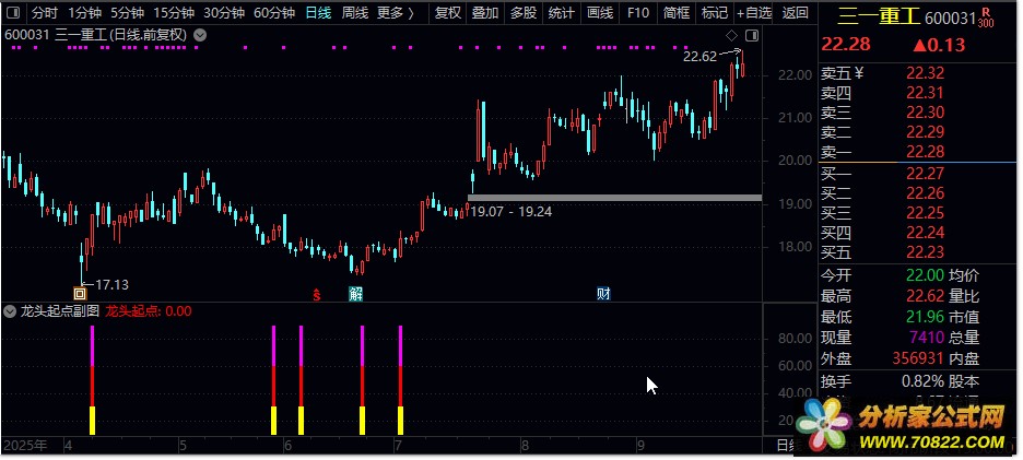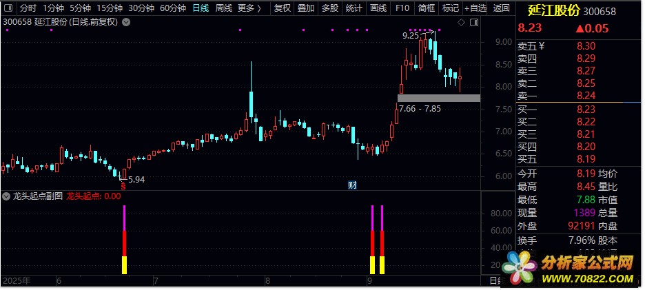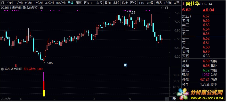 核心逻辑聚焦于"放量突破关键均线+超开盘价6.18%+量价共振"三要素组合,精准定位短线强势股启动点。建议配合止损策略使用,若股价跌破5日均线则需及时离场。本指标适用于捕捉龙头股起涨初期的"龙头起点"信号,通过副图信号与选股功能双重验证,提升短线交易胜率。指标源码已内置三色柱自动标注功能,直观呈现不同强度启动信号,助力投资者快速识别潜力股启动时机。
