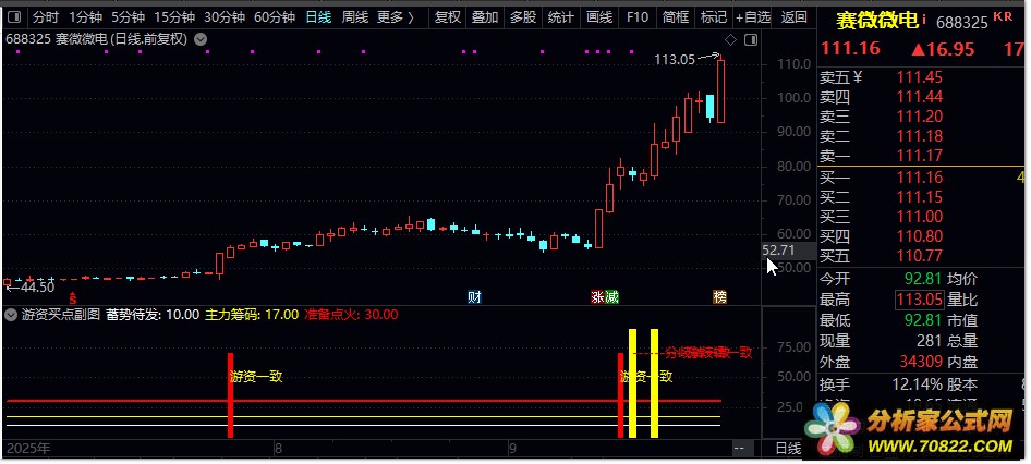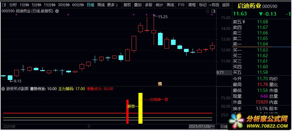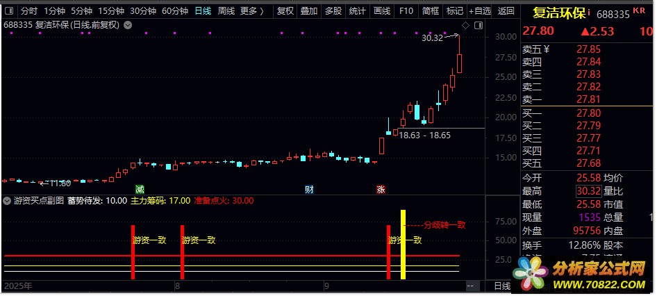• 上穿30(准备点火线):指标显示黄色柱状线,并出现"分歧转一致"文字提示,预示游资即将启动拉升,是较为明确的进场信号。