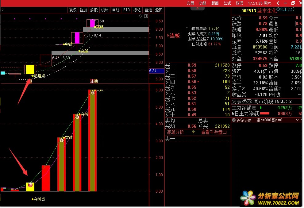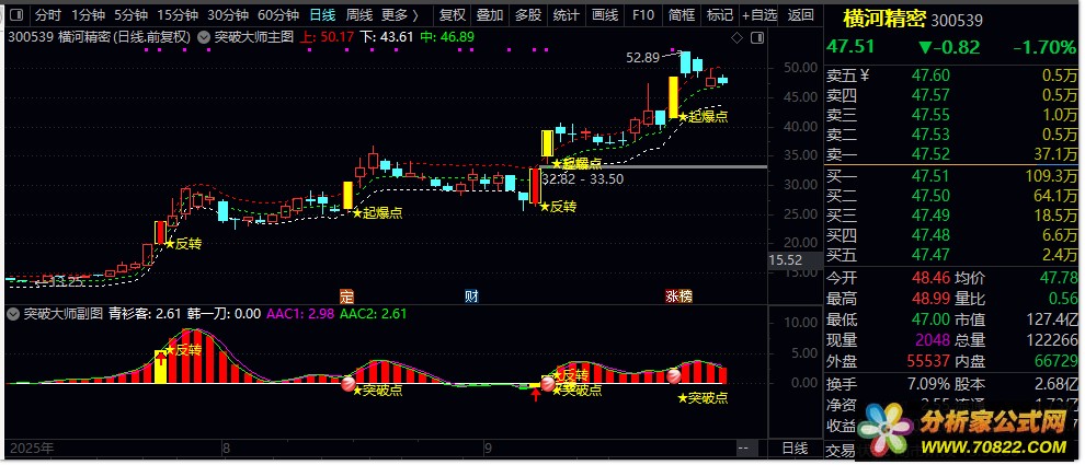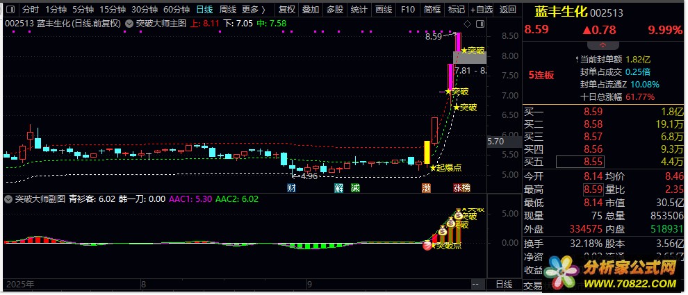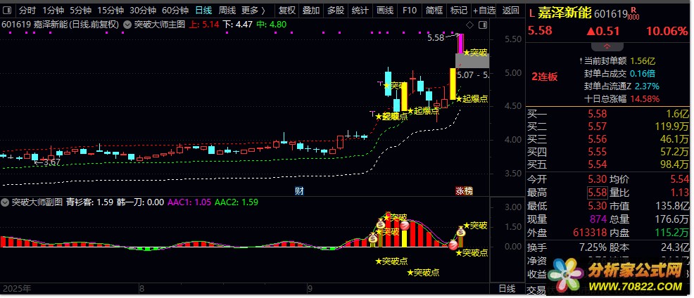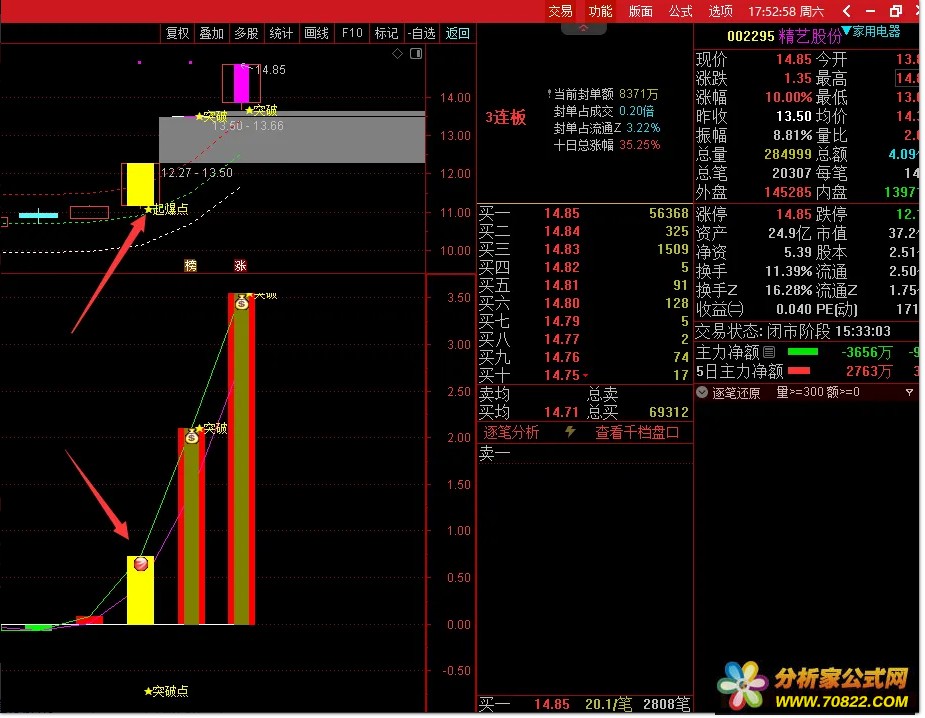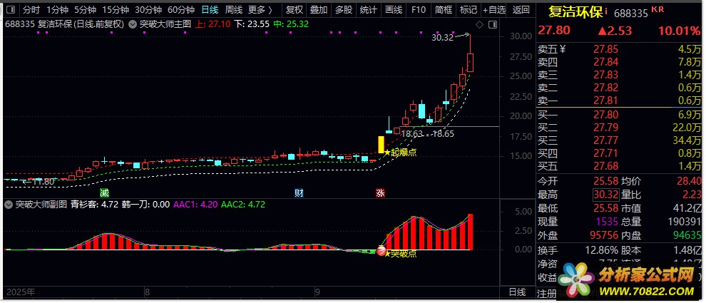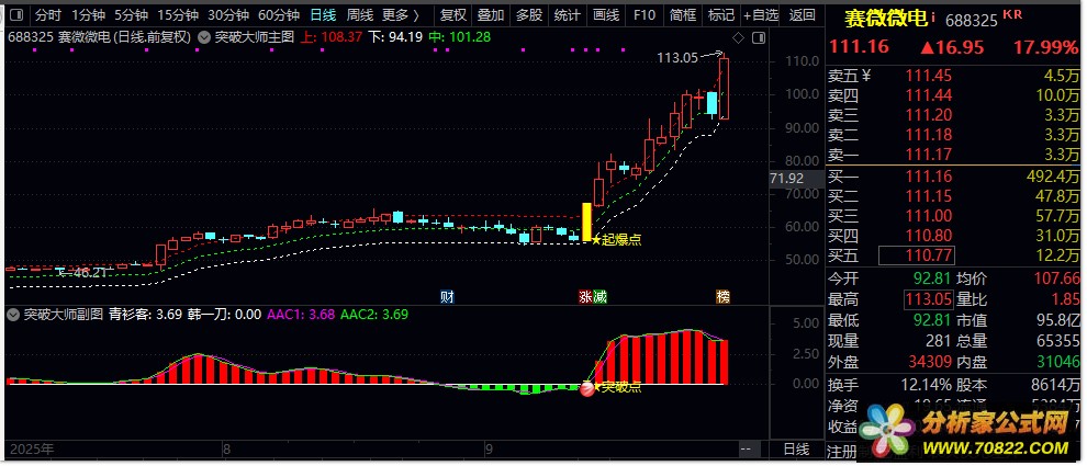 突破信号确认 ,当主图出现突破信号,且副图同时显示突破确认时,可考虑入场。突破信号的确认是确保成功交易的关键,投资者应结合题材热点和市场环境综合判断交易价值。