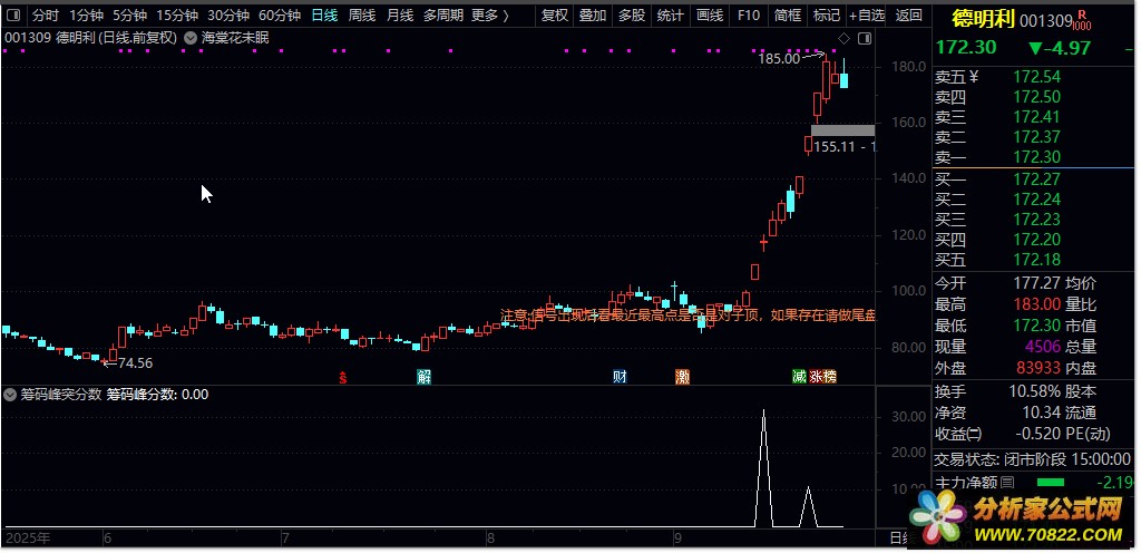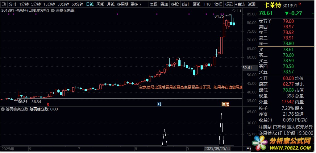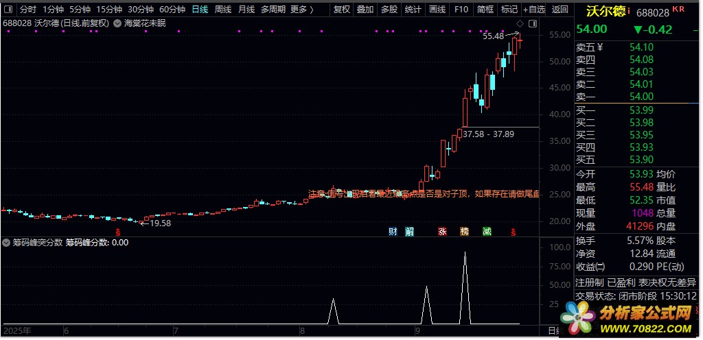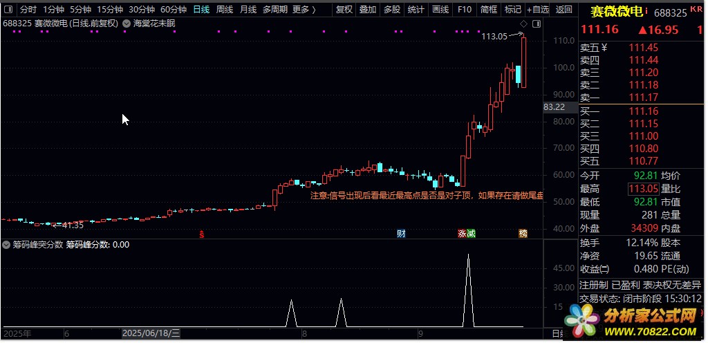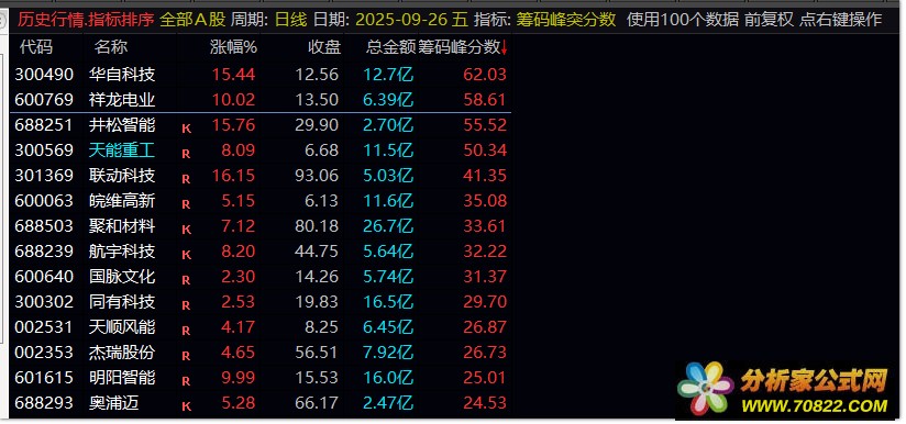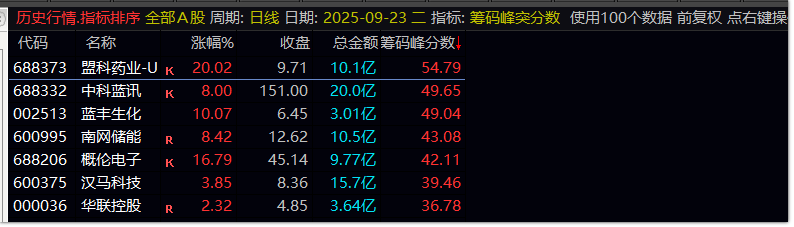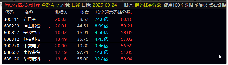 原创 2025【筹码峰突分数】胜率还是蛮高的 做好后,测试一下。因为要调用数据比较多,选股速度很慢,所以我干脆做了个排序的,直接显示分数,也能用在附图。