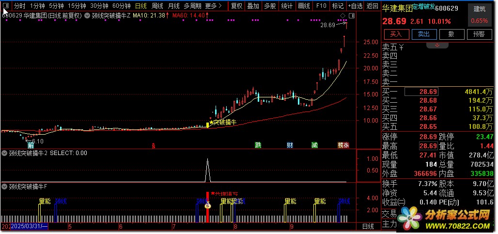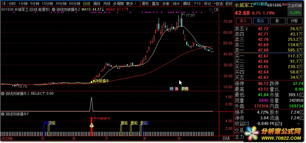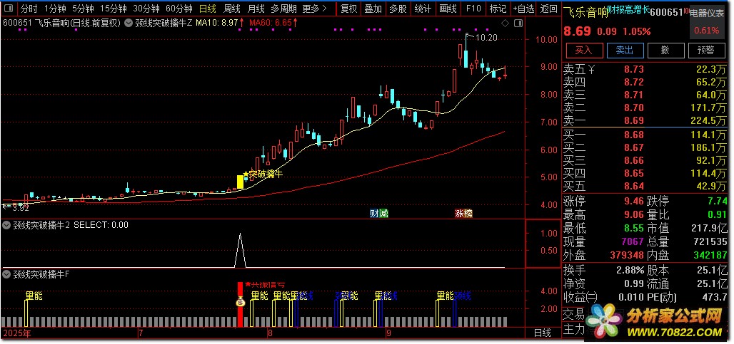 颈线突破擒牛主副图选股指标 量能偏离与颈线突破双条件触发选股信号 指标说明: