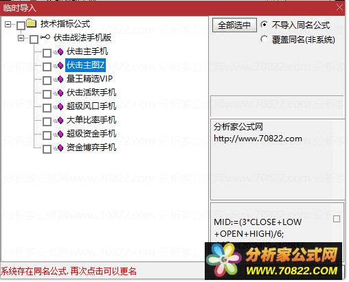 * 关于股票公式时间限制,如果在引入大智慧公式,交易师公式或者飞狐公式的时候,发现公式名称栏是空白的,这时候调整电脑时间到1997年,又能出现公式名称,并且能正常显示,可能是公式使用期限已过。