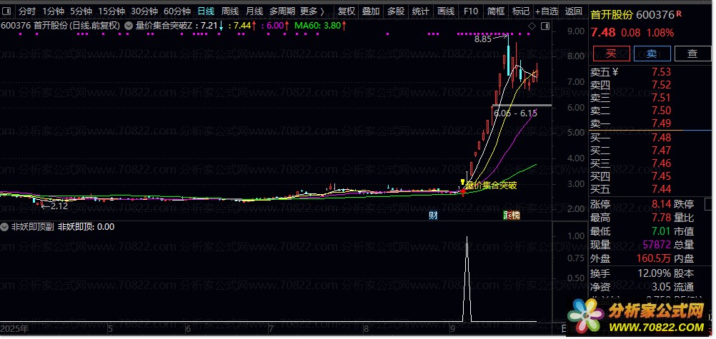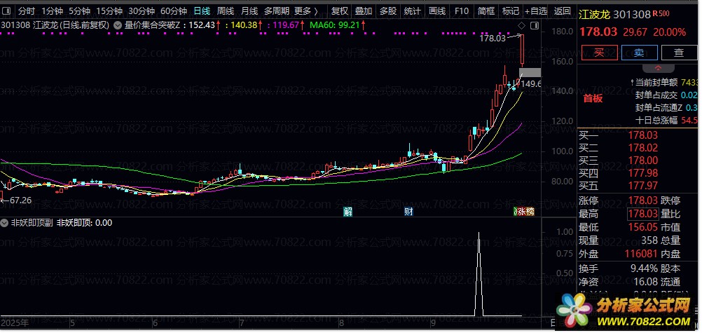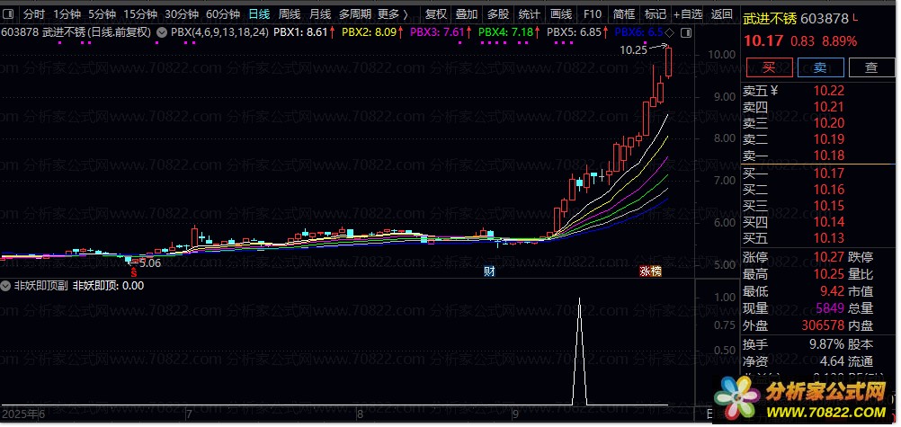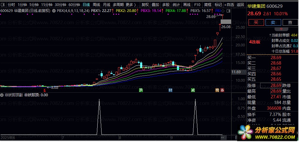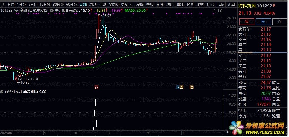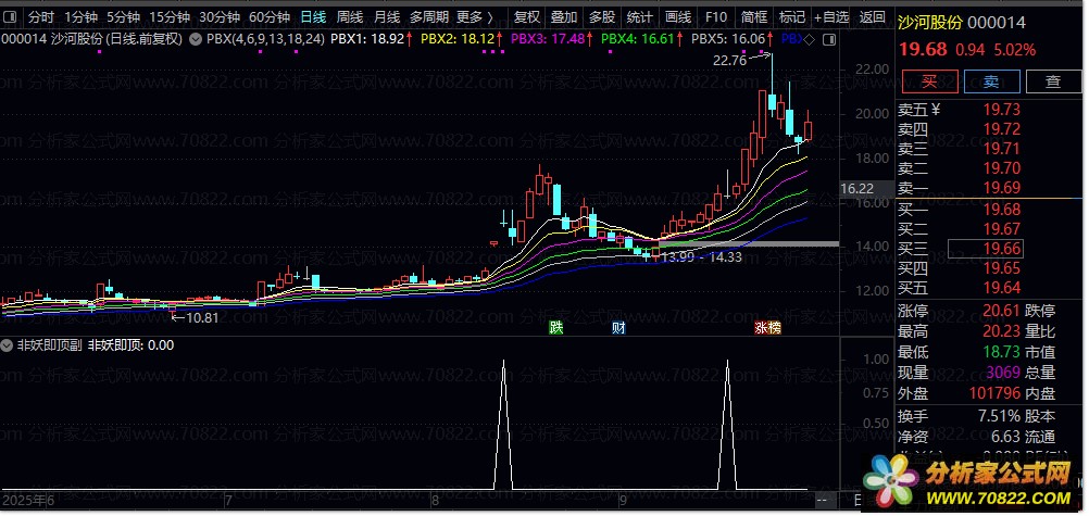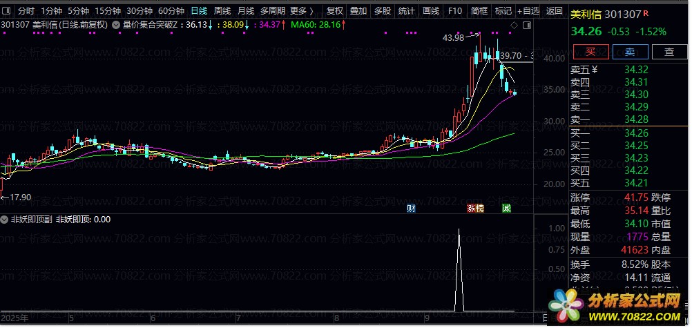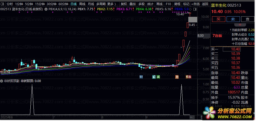 2. 信号触发机制:当短期均线突破长期压力线并经过5日过滤确认后,指标标记“非妖即顶”信号,提示当前个股可能处于加速上涨阶段或临近顶部。