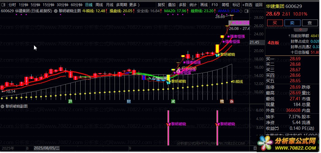 当股价突破牛熊线且趋势线上穿20日均线,同时出现"黎明破晓"信号时,为较佳买入点。指标通过彩色K线、箭头图标和文字提示,使买卖点一目了然,适合中短线操作。