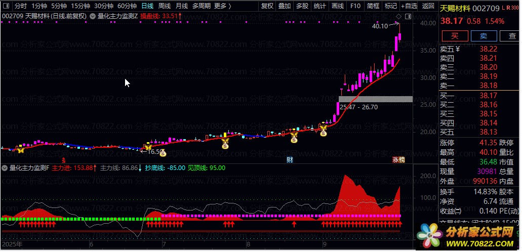 - 关键信号包括“主力进场”(黄色柱状图+图标)和“游资进场”(洋红色柱状图+图标),当主力进大于20且FSZX大于0时触发,游资进场附加10日EMA上穿60日EMA条件。