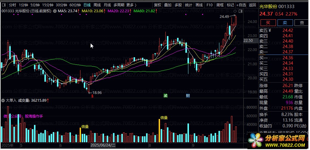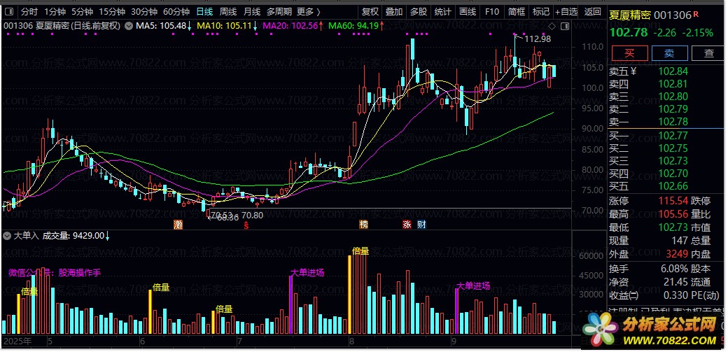 大单入场副图+选股指标,倍量与大单入场双信号异动分析 指标介绍: