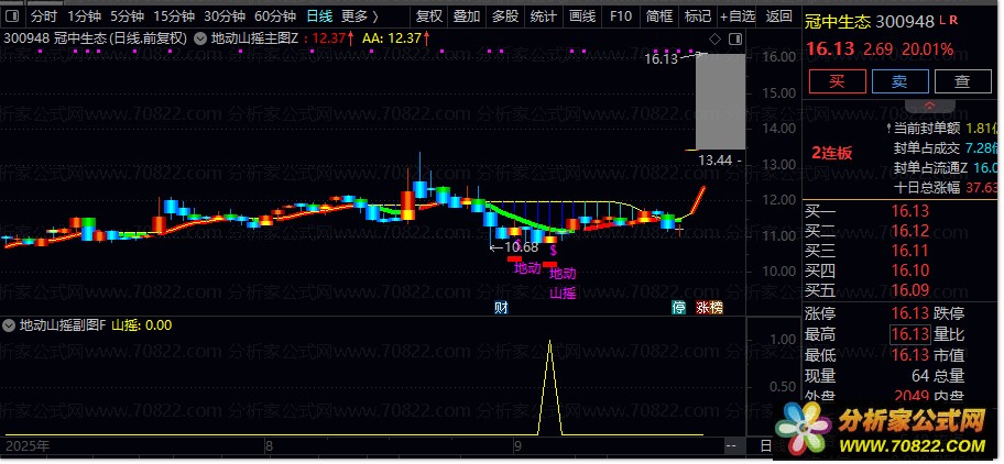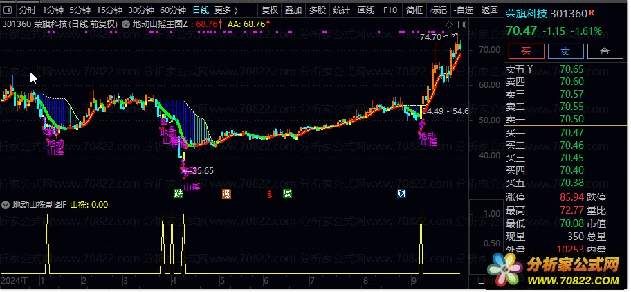 3、主图设有“地动”与“山摇”两大波段抄底信号。依据成语本意,单一信号效果有限,当两信号同时出现或短期内接连显现时,即为完整底部形态,后续往往孕育龙头妖股;