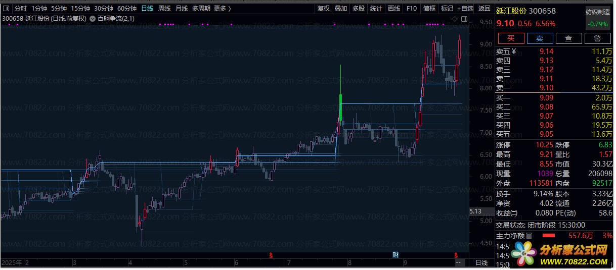2、不同于江山如画指标的DMA衰减辅助线,百舸争流专注成本均价射线延伸,通过30线量峰前高渐变延伸形成清晰层次感。该指标在量价关系展现上更显整体性,成本线分层延伸特性尤为突出。虽将转向均线策略研究,仍愿为执着量学的投资者保留这份技术火种——这正是技术分享的初心所在。