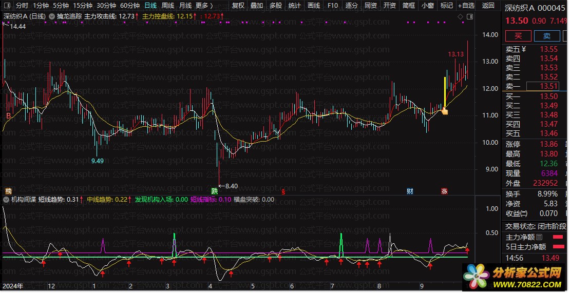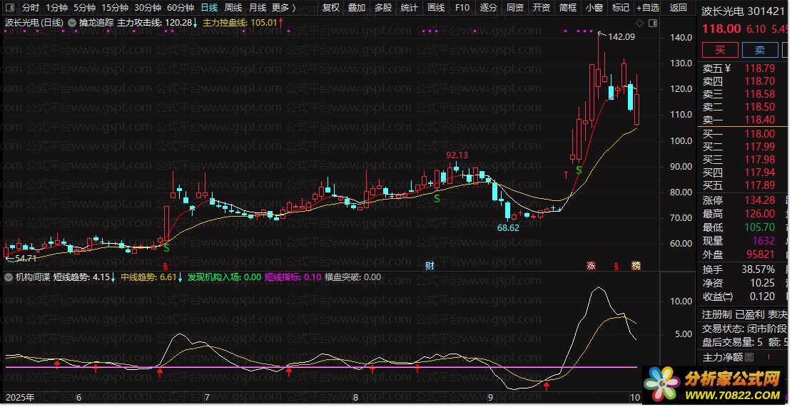当“发现机构入场”信号(绿色柱状)与“短线指标”粉色信号共振时,表明主力资金活跃,可结合趋势线金叉及DMI指标强化买入时机。