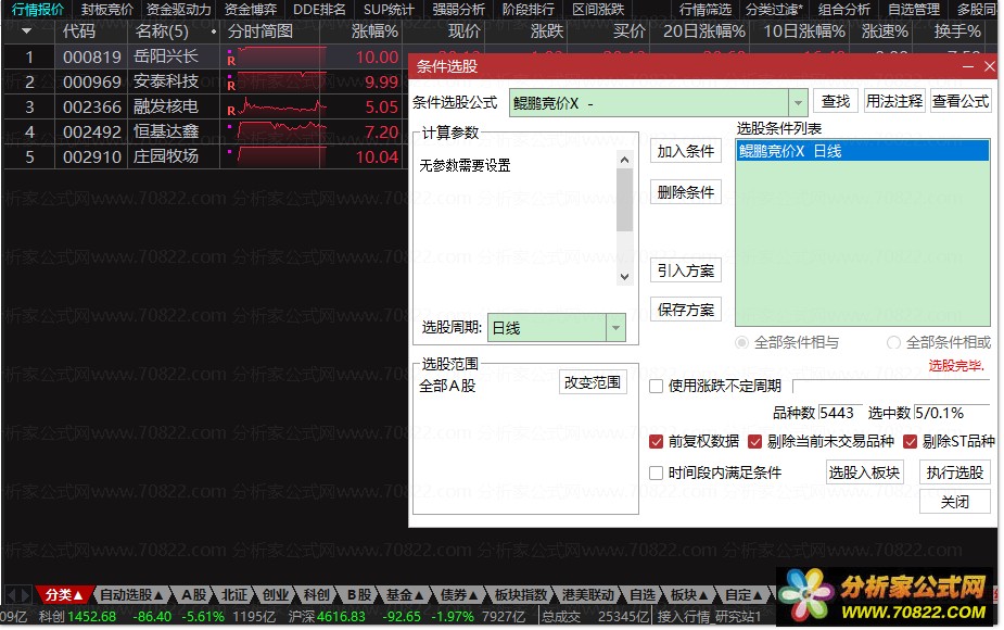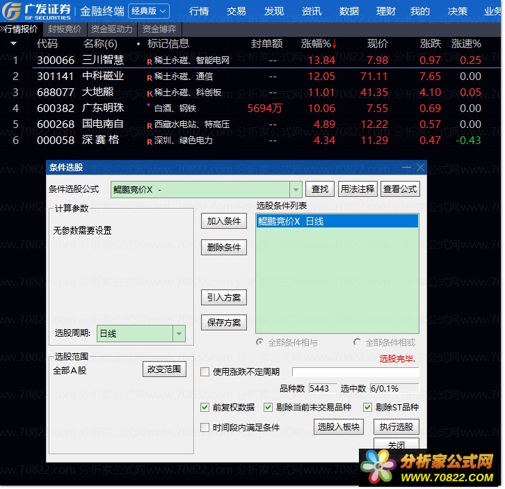 在交易日9:25-9:30期间,进入通达信排序界面(.401),选择“鲲鹏竞价”指标,按数值从高到低排列。优先选取数值=1且非一字涨停的个股,结合市场环境在开盘后适时介入。