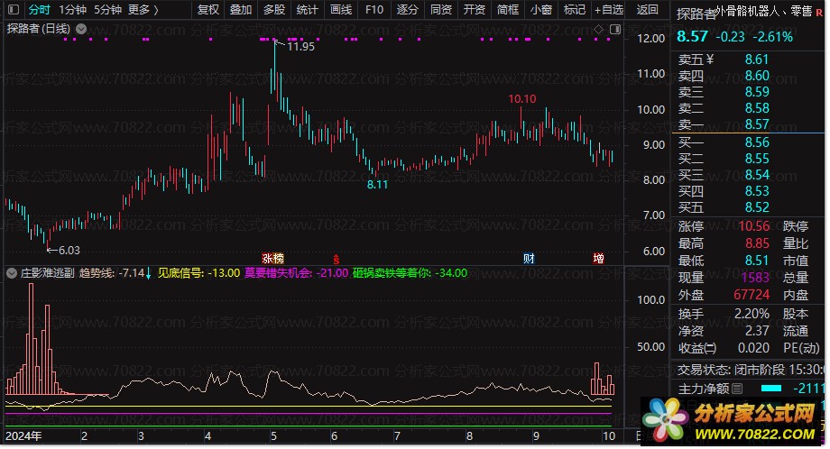『庄影难逃』副图+选股指标:千倍暴力庄捕捉攻略(使用方法详解) “庄影难逃”作为副图指标,附带选股功能且不含未来函数。A股市场无只涨不跌股,但被低估且有庄家潜伏的股票潜力巨大,特定指标可助投资者识别庄家。以下为指标使用方法:
