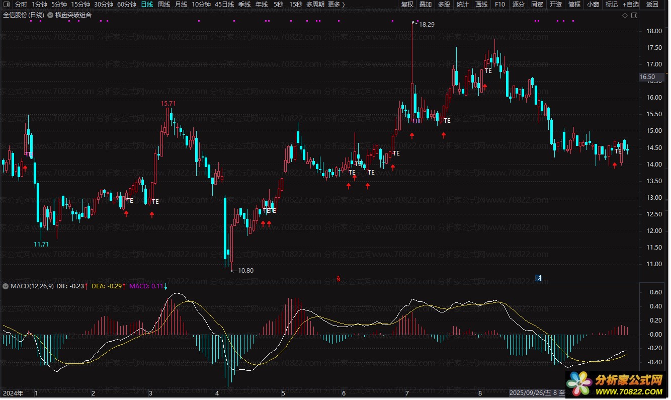 本公式整合了八种经典的横盘突破技术形态,通过多维度分析(价格波动、布林带、量价关系、MACD、均线、箱体、KDJ、双底)精准识别突破时机。当股价结束长期盘整并放量突破关键压力位时,公式会在K线下方标记彩色字母(TA-TH),直观提示买入信号。
