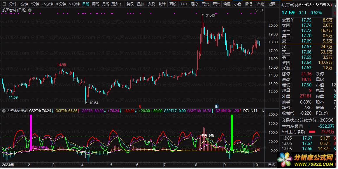 彩色柱子直观显示大资金的流入流出情况。紫色柱子代表多方大资金进场,通常推动股价上涨;绿色柱子代表空方大资金撤离,可能引发下跌。这一设计使投资者能实时监控主力资金动向,及时跟进或规避风险。