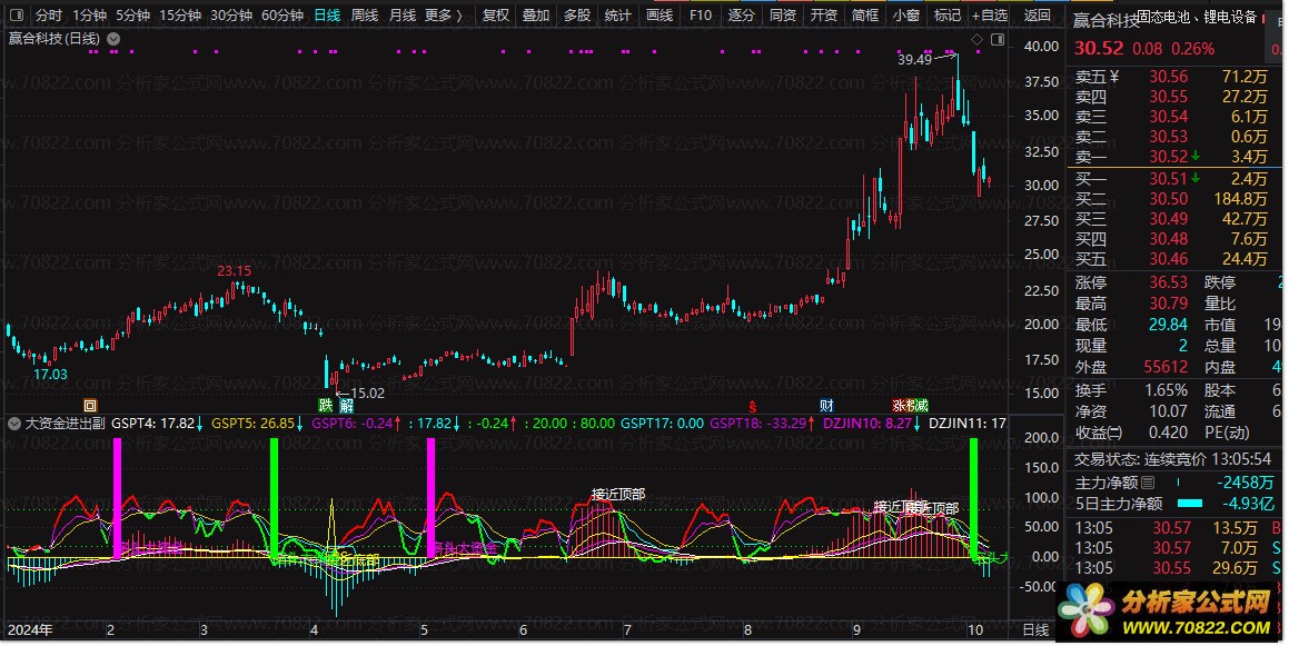 〖大资金进出副图〗精准捕捉超买超卖与背离信号,高效识别短期顶底 大资金进出副图指标整合了趋势、资金、顶底和信号四大维度,通过红蓝柱子、三条线、彩色柱子和BM文字的组合,助力投资者高效识别超买超卖、背离及短期顶底。这一工具特别适用于短线交易,能显著提升对主力资金动向和趋势转折的把握能力。